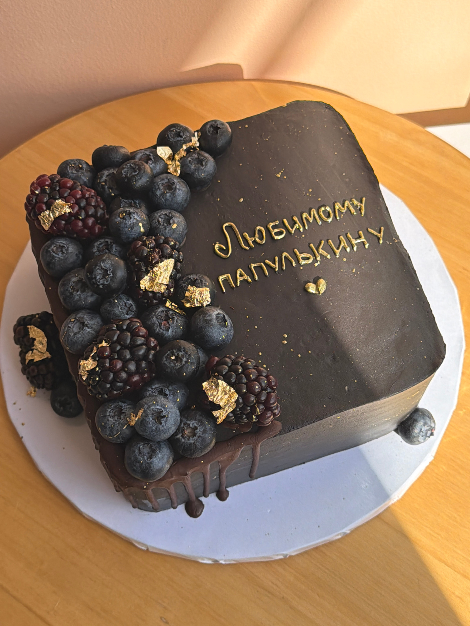 A top-down, eye-level shot shows a square chocolate cake, decorated with blueberries, blackberries, and gold leaf accents, on a white cake board resting on a light-colored wooden surface. The cake has…read more