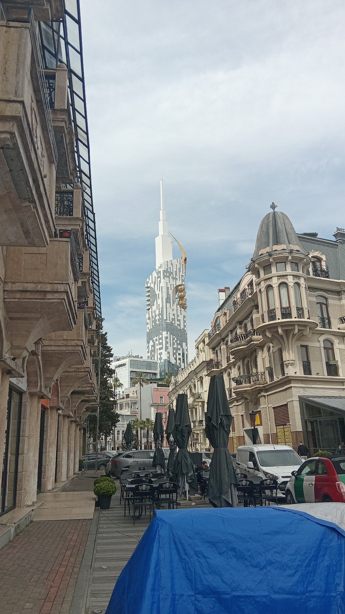 The image captures a street scene in Batumi, Georgia, showing a mix of architectural styles. The prominent feature is the contrasting building design. The location is along a street lined with outdoorβ¦read more