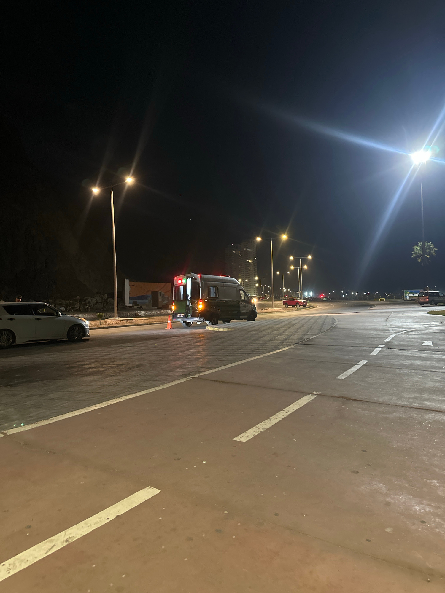 A nighttime shot oriented sideways shows a street scene in Arica, Chile. The right half of the image depicts a wide paved area, possibly a road or parking lot, marked with white lines. To the left, a…read more