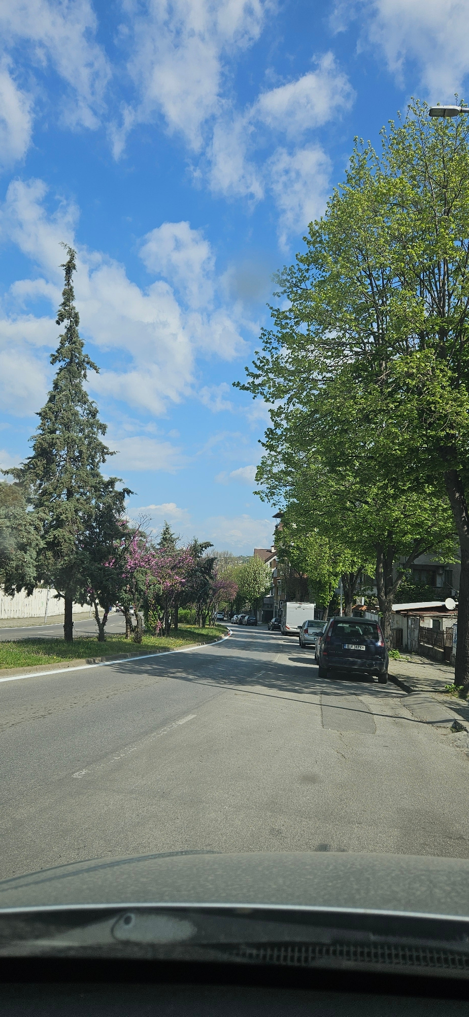 The image shows a street scene in Blagoevgrad, Bulgaria. The view is from inside a vehicle, looking out at a tree-lined street with cars parked along the side. The sky is blue with scattered clouds. T…read more