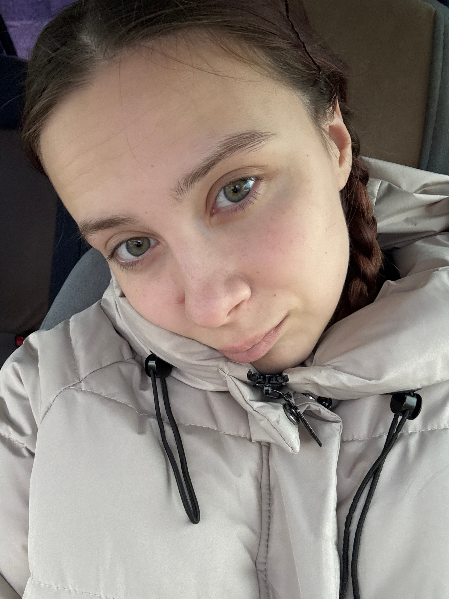 A young, light-skinned female with braided auburn hair is looking directly at the camera with a neutral expression. Her eyes are green. She is wearing a light beige or gray puffy jacket with black dra…read more
