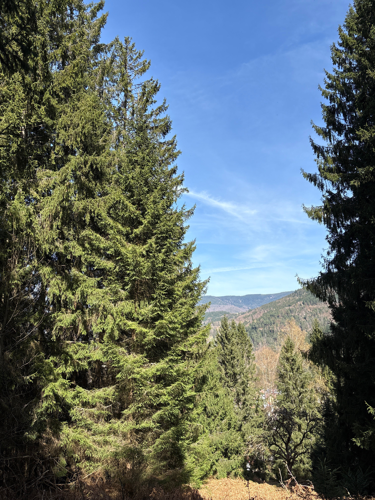 The image shows a view looking upwards through trees. The sky is blue with thin, wispy clouds. In the distance, a tree covered slope can be seen. The trees in the foreground are green. The picture was…read more
