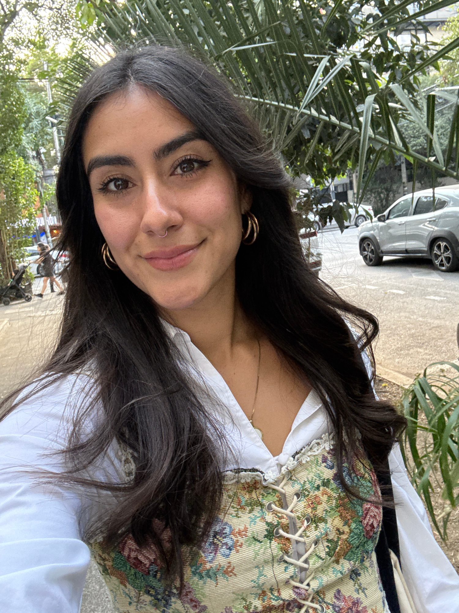 A young woman with dark hair and a nose ring is smiling slightly at the camera. She is wearing gold hoop earrings, a white shirt, and a tapestry-style corset top with lace-up detailing. The background…read more