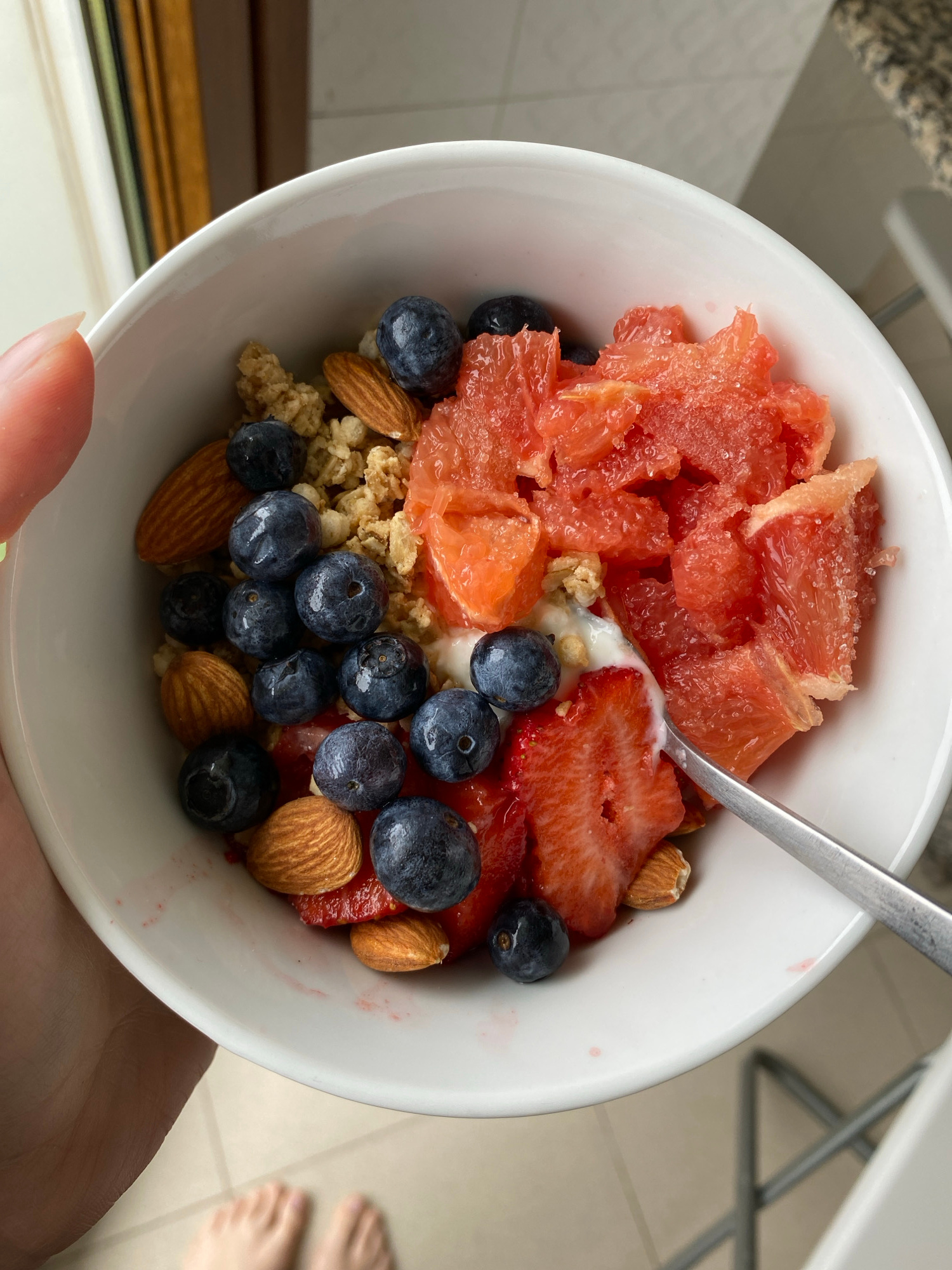 A close-up, high-angle shot depicts a white bowl held in a person's hand, filled with food. The bowl contains grapefruit segments, sliced strawberries, blueberries, almonds, and granola. A silver spoo…read more