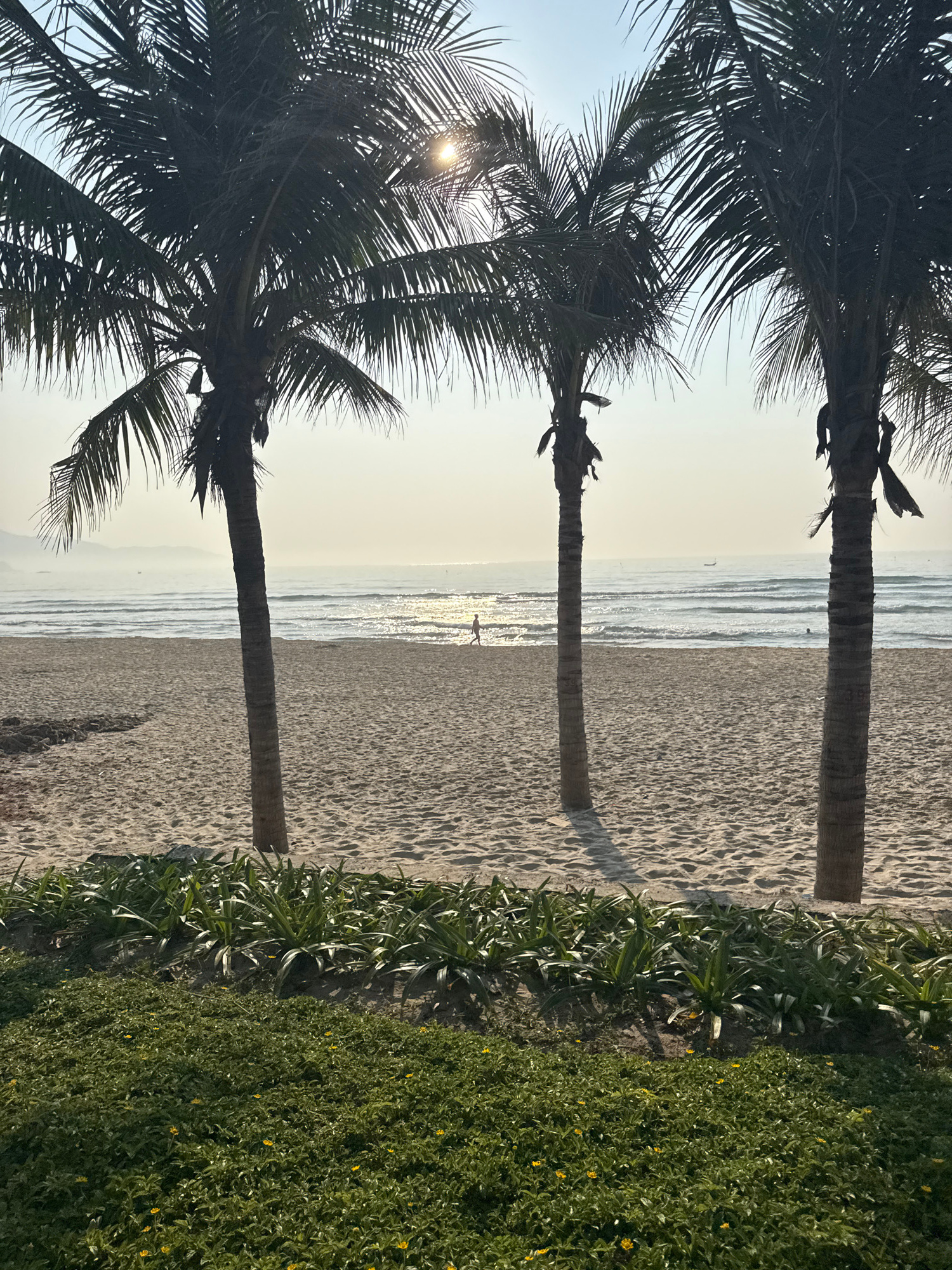 The image shows a beach scene in Đà Nẵng, Vietnam. Three palm trees stand between the viewer and the ocean. Their trunks are dark silhouettes, with sunlight visible through the fronds of the tree clos…read more