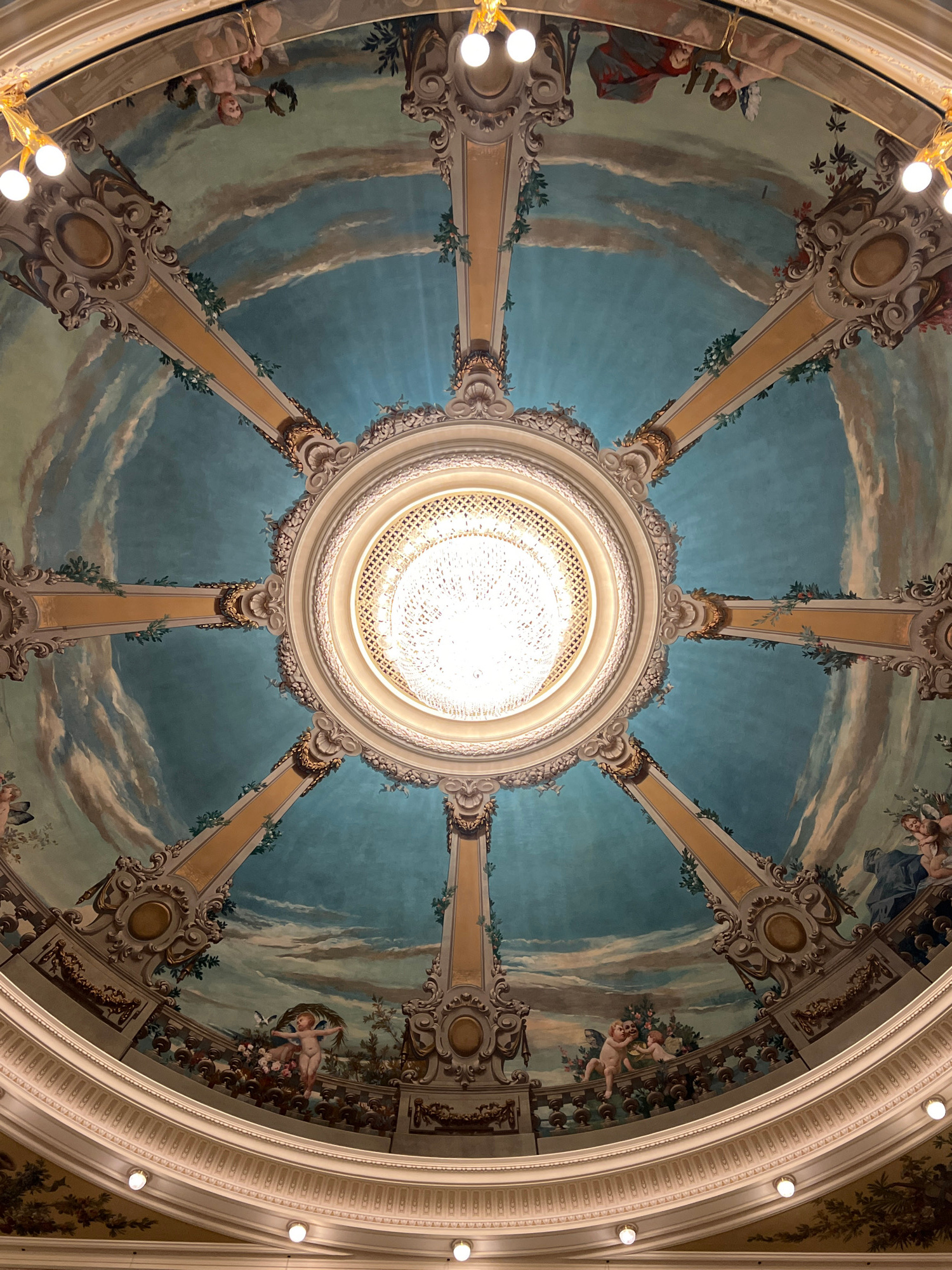 The image shows a ceiling of a theatre, presumably located in Saint Petersburg, Russia. In the center of the frame is a large, circular chandelier. The ceiling around the chandelier is painted with a…read more