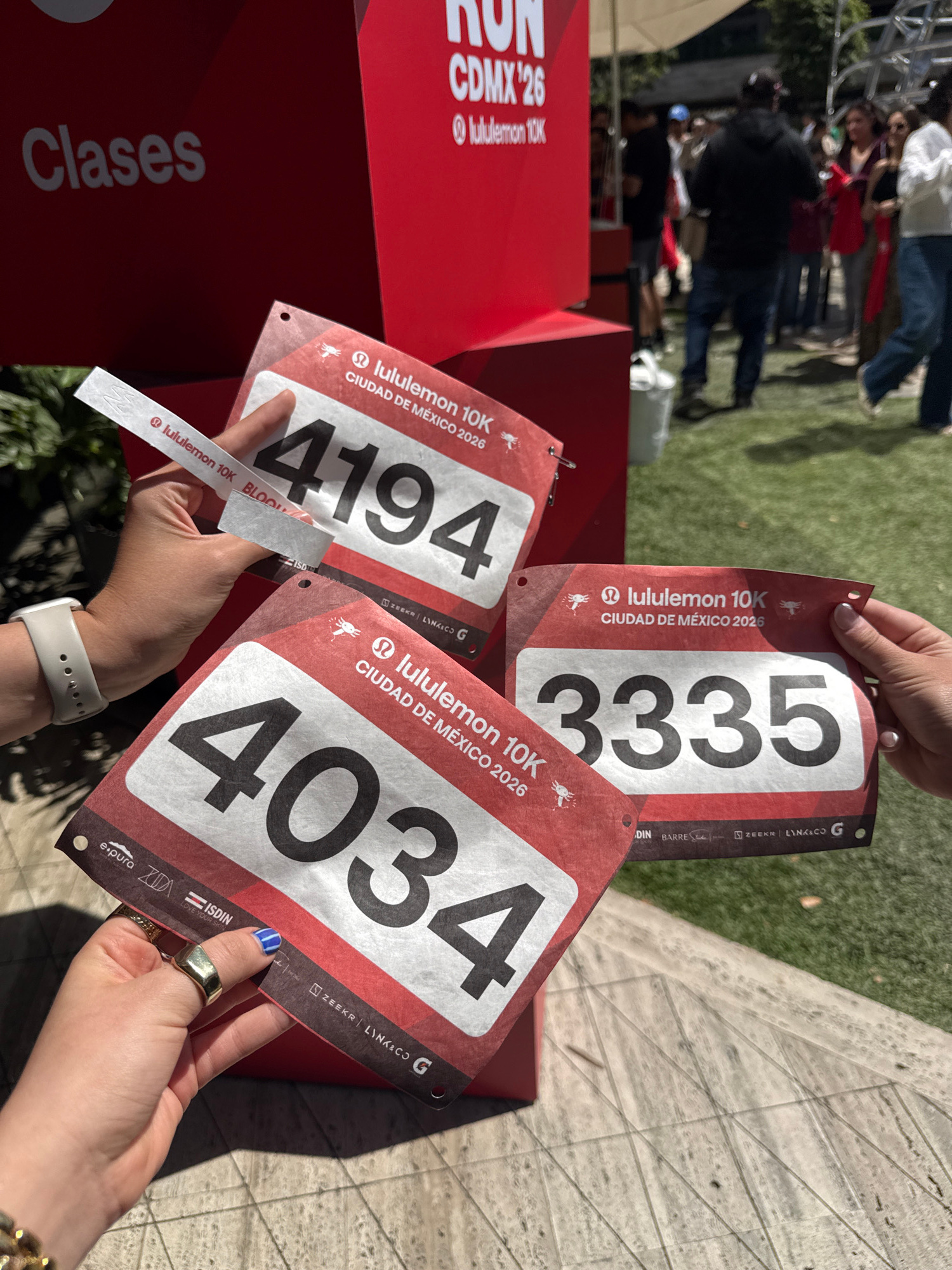 Here is a description of the image: The image shows three race bibs being held up, likely for a "lululemon 10K" event in Mexico City in 2026. The bib numbers are 4194, 3335, and 4034. The bibs featur…read more