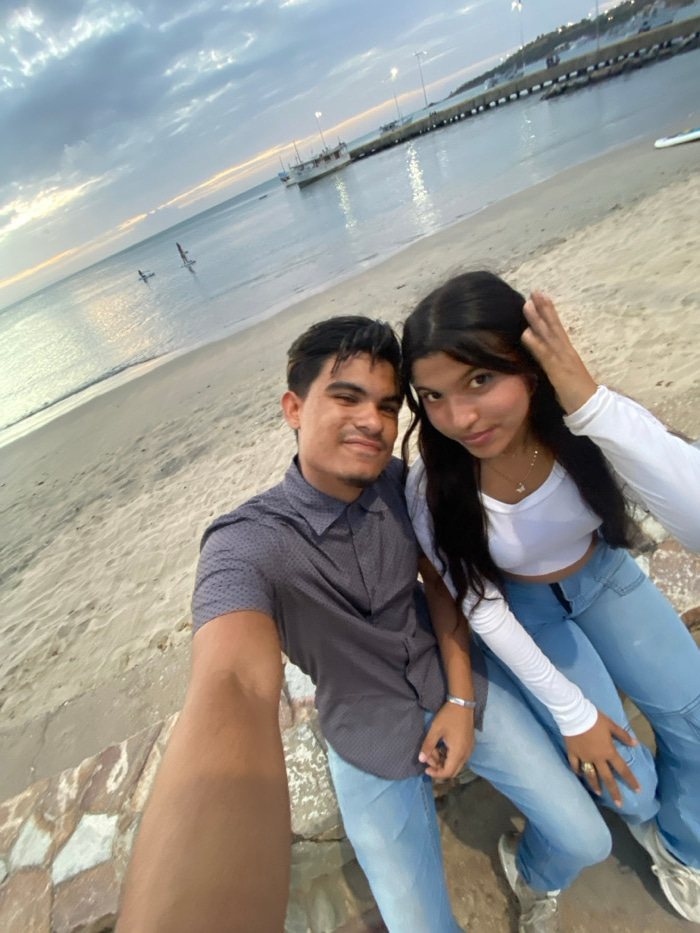 A young couple poses for a selfie on a beach. The woman, with long dark hair, wears a white long-sleeved crop top and light jeans. Her hand rests on her head. The man, wearing a dark patterned shirt a…read more