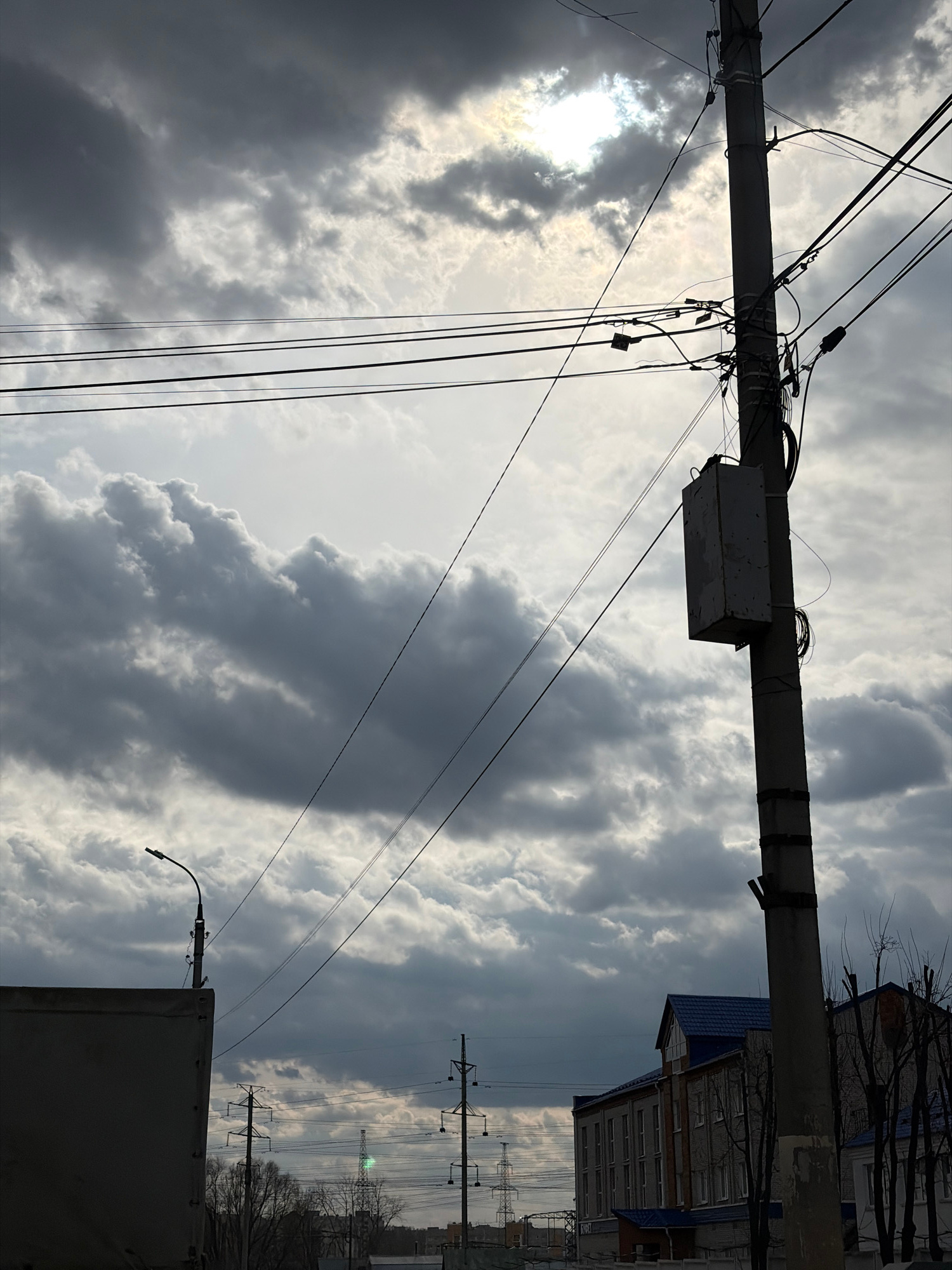 An outdoor, low-angle photograph captures a dense network of utility wires and cables against a cloudy sky in Chaikovsky, Russia. The primary subject is a dark, silhouetted utility pole running horizo…read more