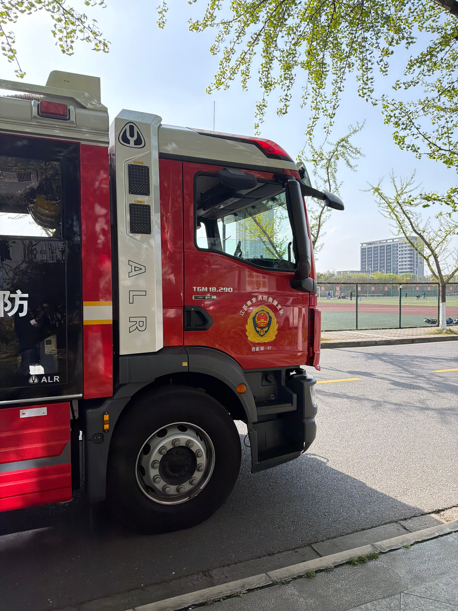 The image shows a red and white fire truck parked on a paved road, near a sidewalk. The side of the truck displays the letters "ALR" and a Chinese emblem with text indicating "Jiangsu Province Fire an…read more