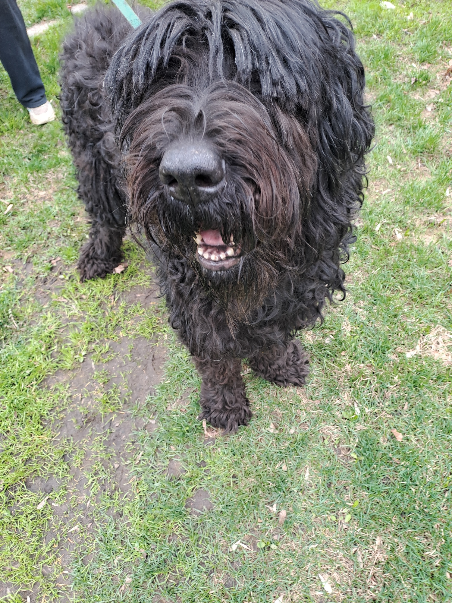 A black, long-haired dog lies on its back in a grassy area. The dog's head is tilted, revealing its teeth. A foot wearing a black shoe is visible in the lower left corner of the image. The grass is pa…read more