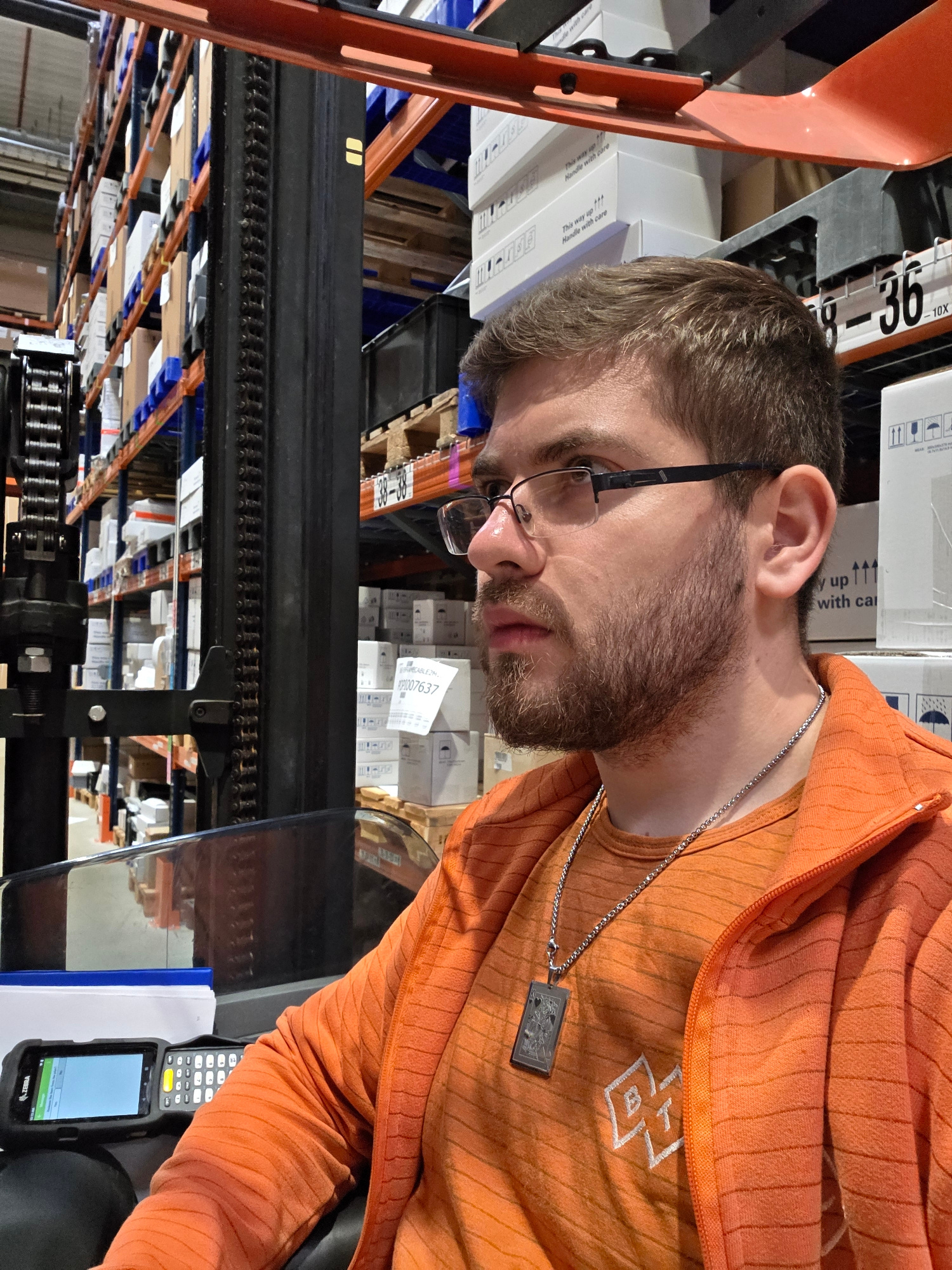 A man with a beard and glasses is lying on boxes in what appears to be a warehouse or storage facility. He is wearing an orange jacket and a silver chain with a pendant. A Zebra mobile device is next…read more