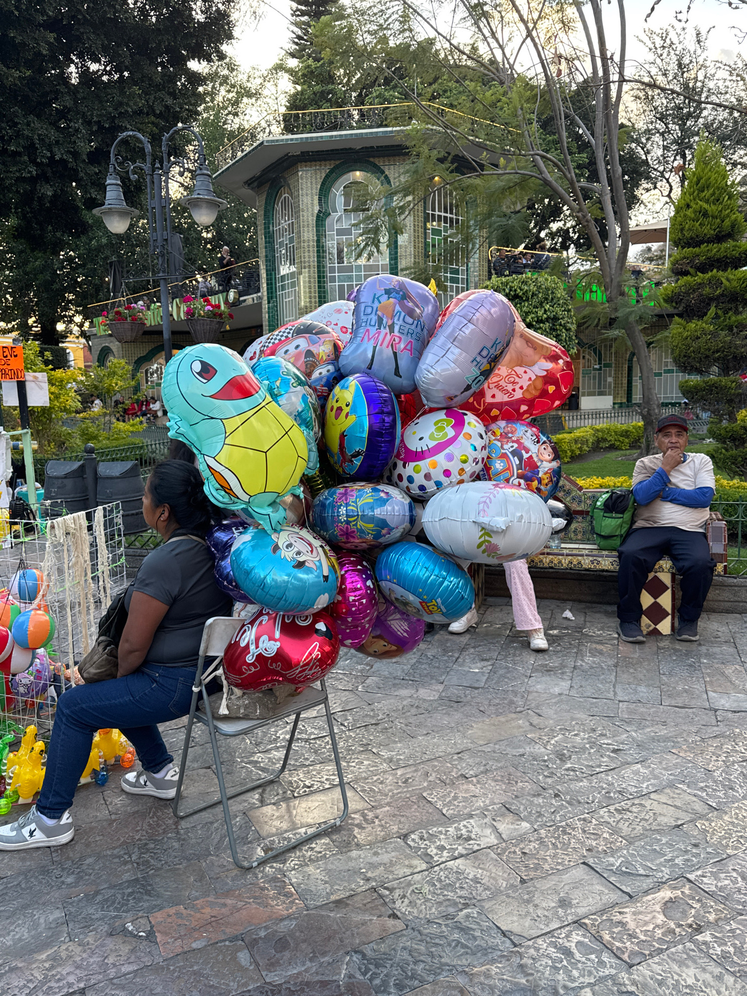 The image, taken in Atlixco, Mexico, shows a woman standing behind a metal cart piled high with colorful character-themed balloons, including Squirtle, Hello Kitty, and Paw Patrol designs. She wears a…read more