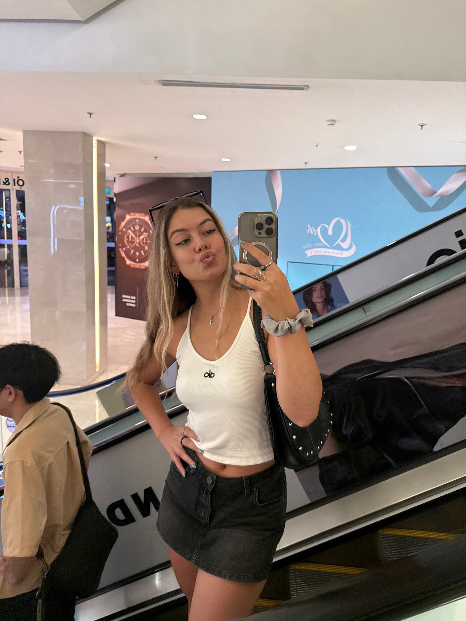 A young woman with blonde hair and sunglasses is taking a selfie on an escalator in a shopping mall in Thủ Đức, Vietnam. She is wearing a white tank top with a logo, a black skirt, and carrying a blac…read more