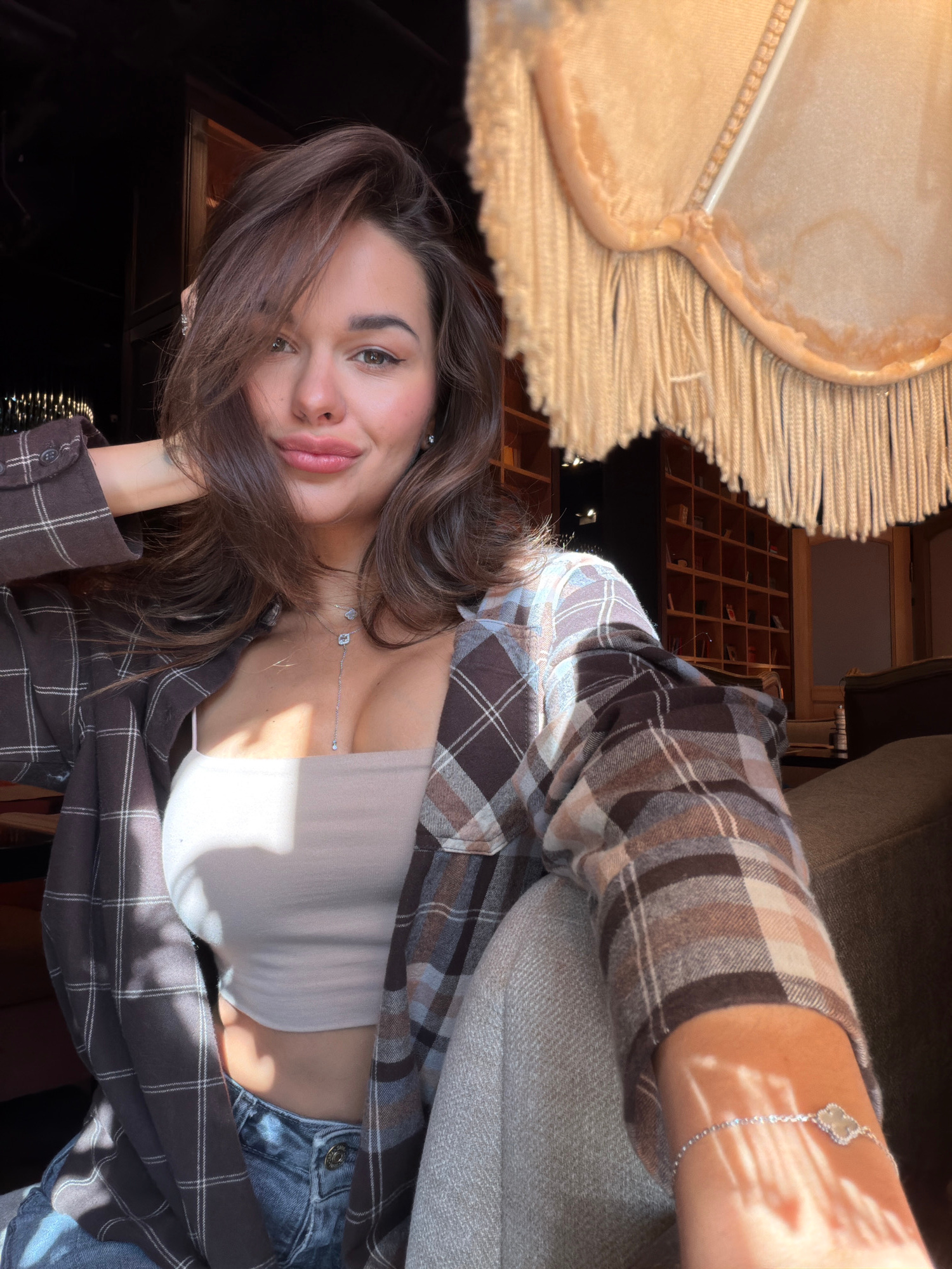 A young woman is posing for a photo. She is wearing a brown and tan plaid shirt, a white tank top, and blue jeans. She is also wearing a silver necklace and a bracelet. She is resting her head on her…read more