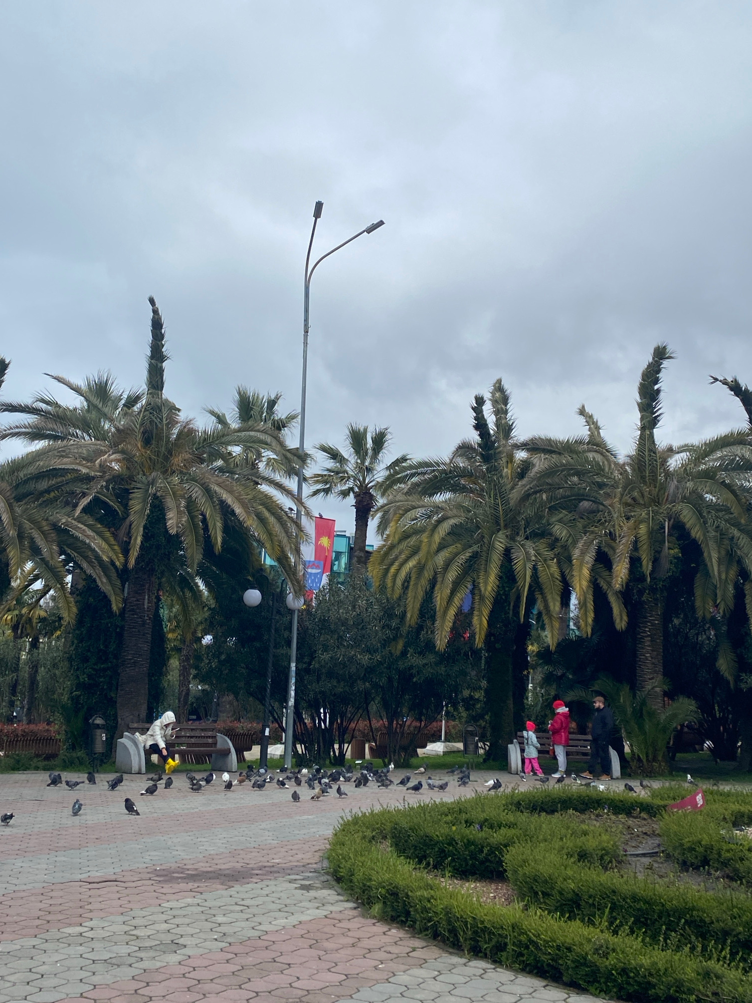 The image captures a park scene in Sochi, Russia. Several tall palm trees line the pathway. A lamppost stands prominently against a cloudy sky. The pathway is paved with interlocking red and white pat…read more