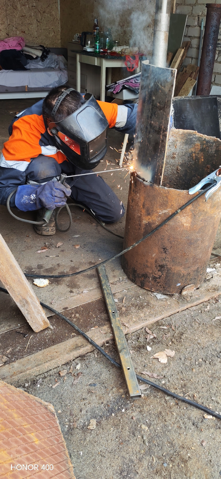 A person wearing protective welding gear, including a mask and gloves, is welding a metal object outdoors in Chaikovsky, Russia. The person is kneeling on a concrete surface and using a welding torch…read more