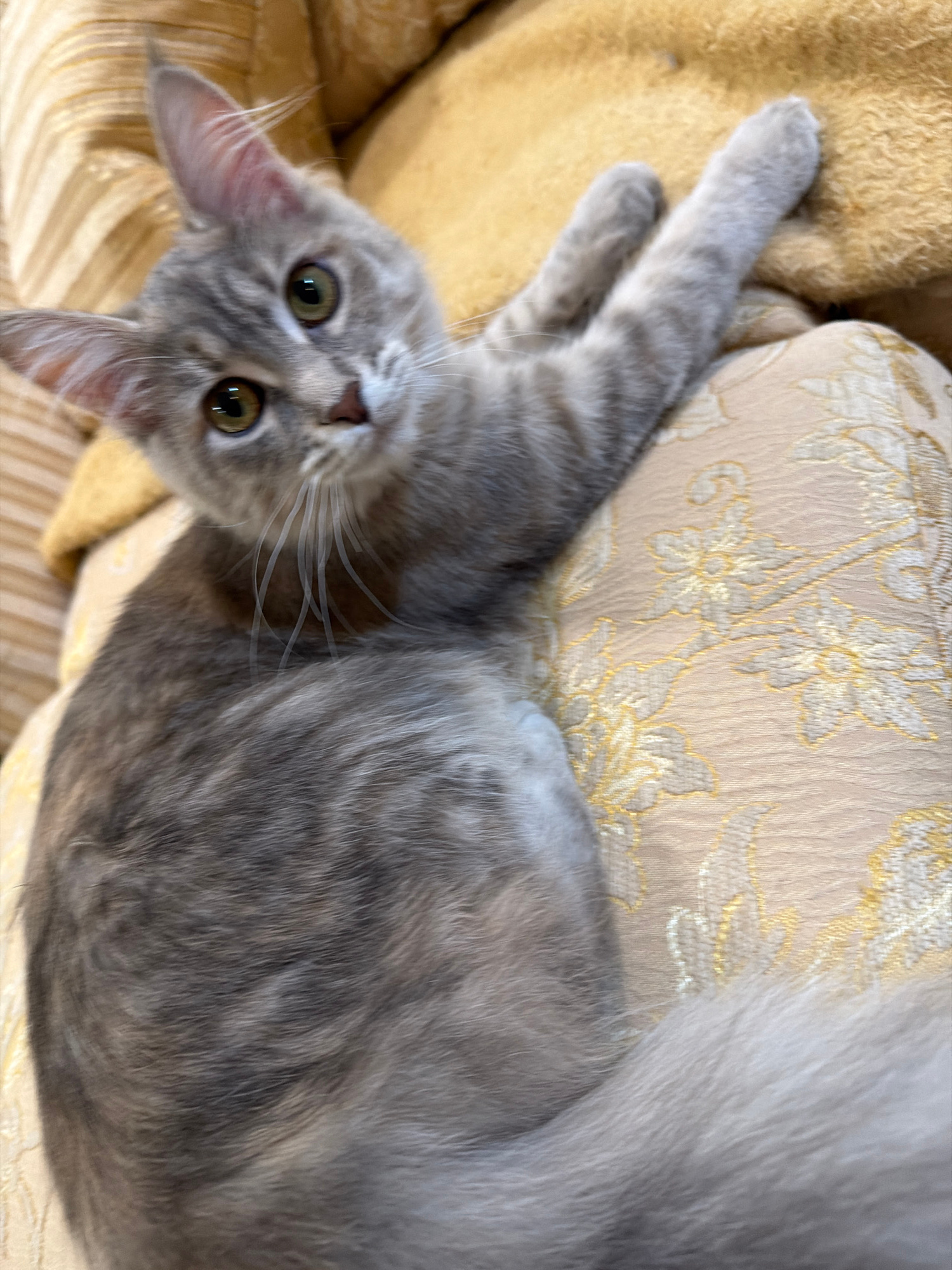 A grey cat lies on a patterned, light-yellow cushion. The cat is looking directly at the camera, with its front paws extended upwards. The cat's tail curves around its body. The location is not discer…read more