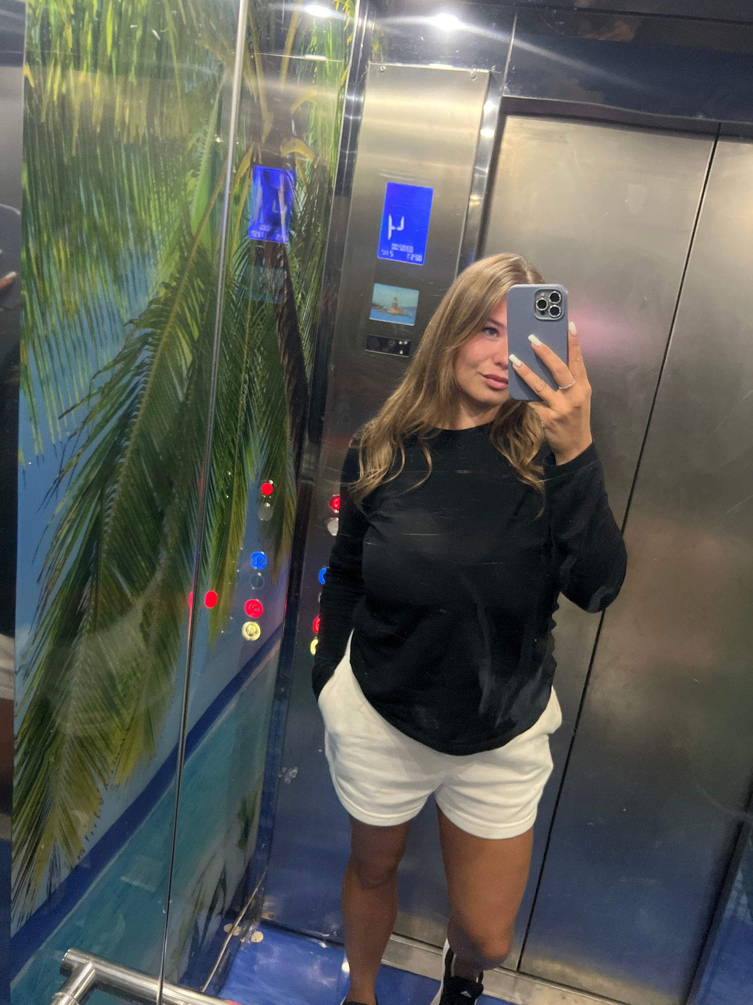 A woman stands in an elevator, holding a smartphone to take a selfie. She is wearing a black long-sleeved top and white shorts with black and white sneakers. The elevator has mirrored walls adorned wi…read more