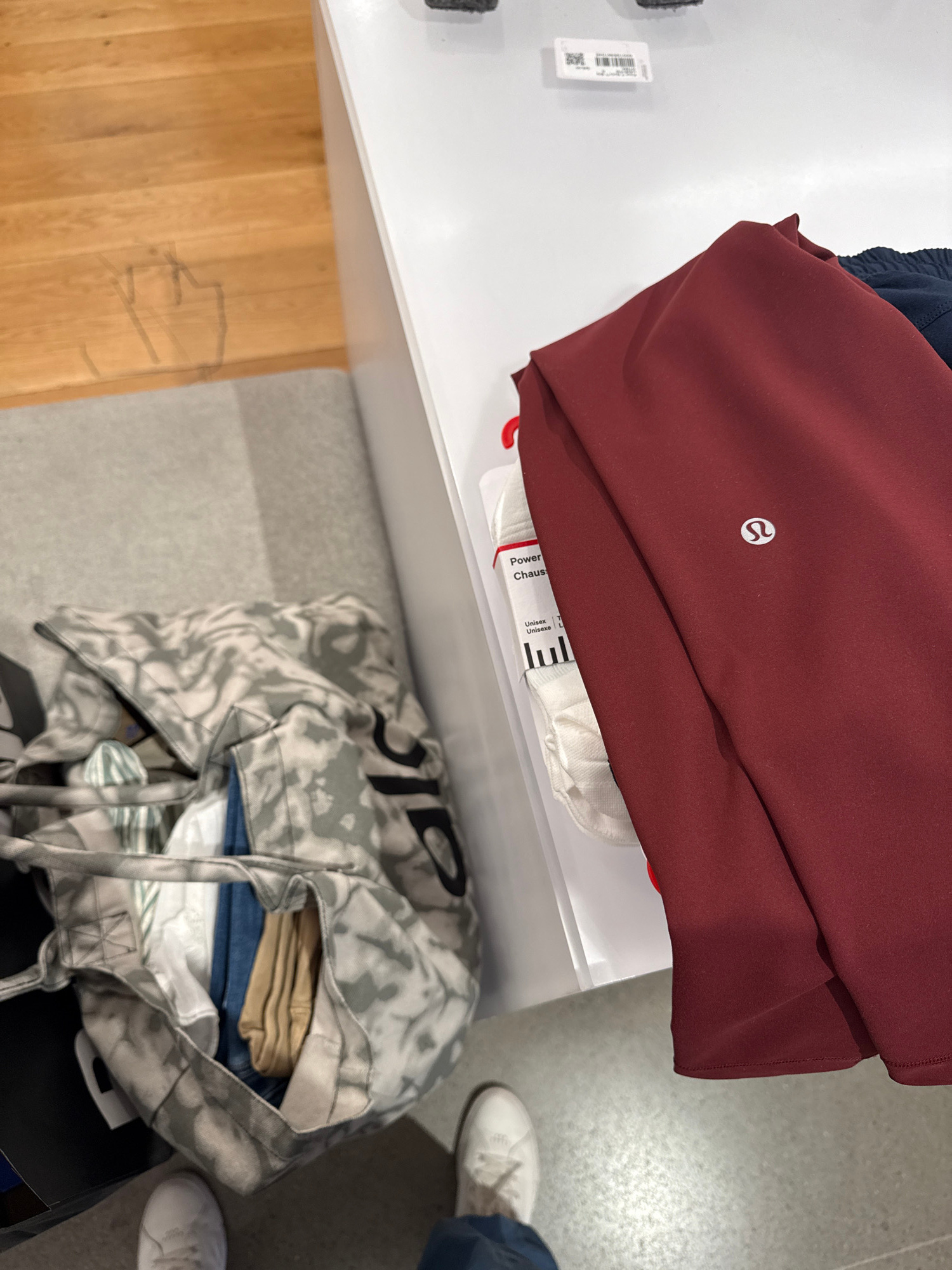 The image shows a display table in what appears to be a retail environment. On the table is a folded burgundy garment with a visible logo, possibly clothing. A white bag containing what looks like clo…read more