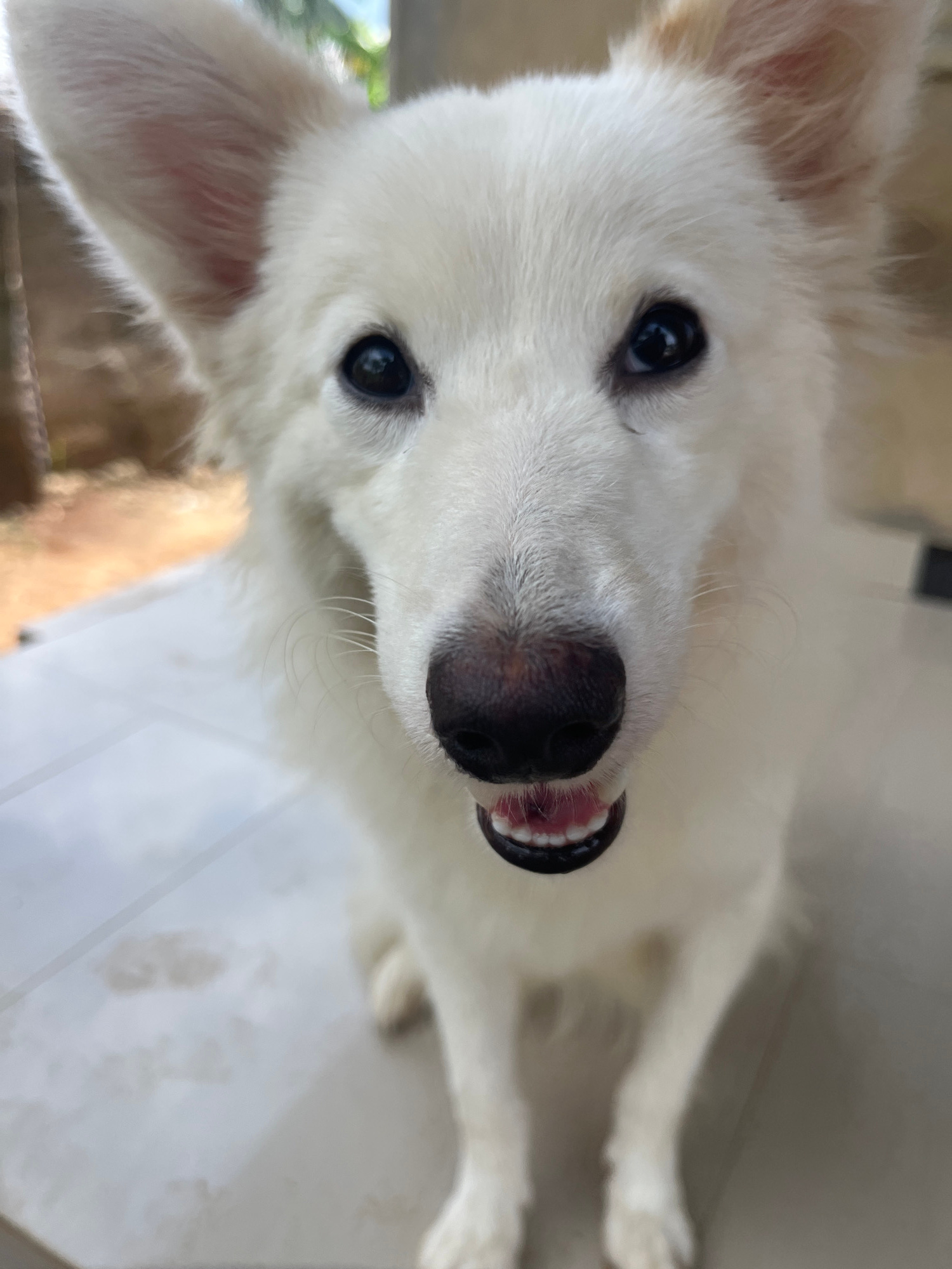 A white dog is looking directly at the camera. The dog is indoors. The floor is white tile. The location is unspecified.