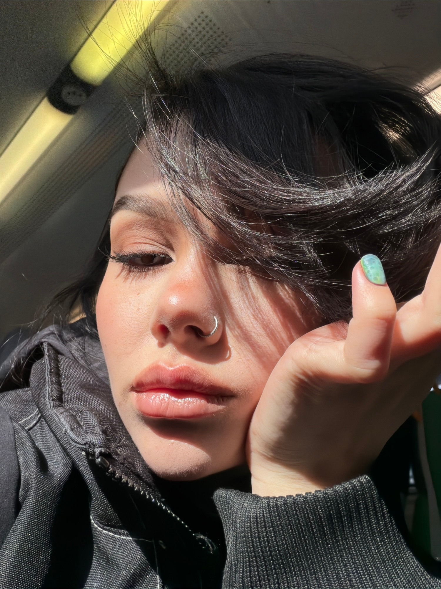 A close-up, canted-angle portrait of a young woman with dark hair, fair skin, and a silver nose ring. The woman is partially obscured by her hair and her right hand, the index finger adorned with a li…read more