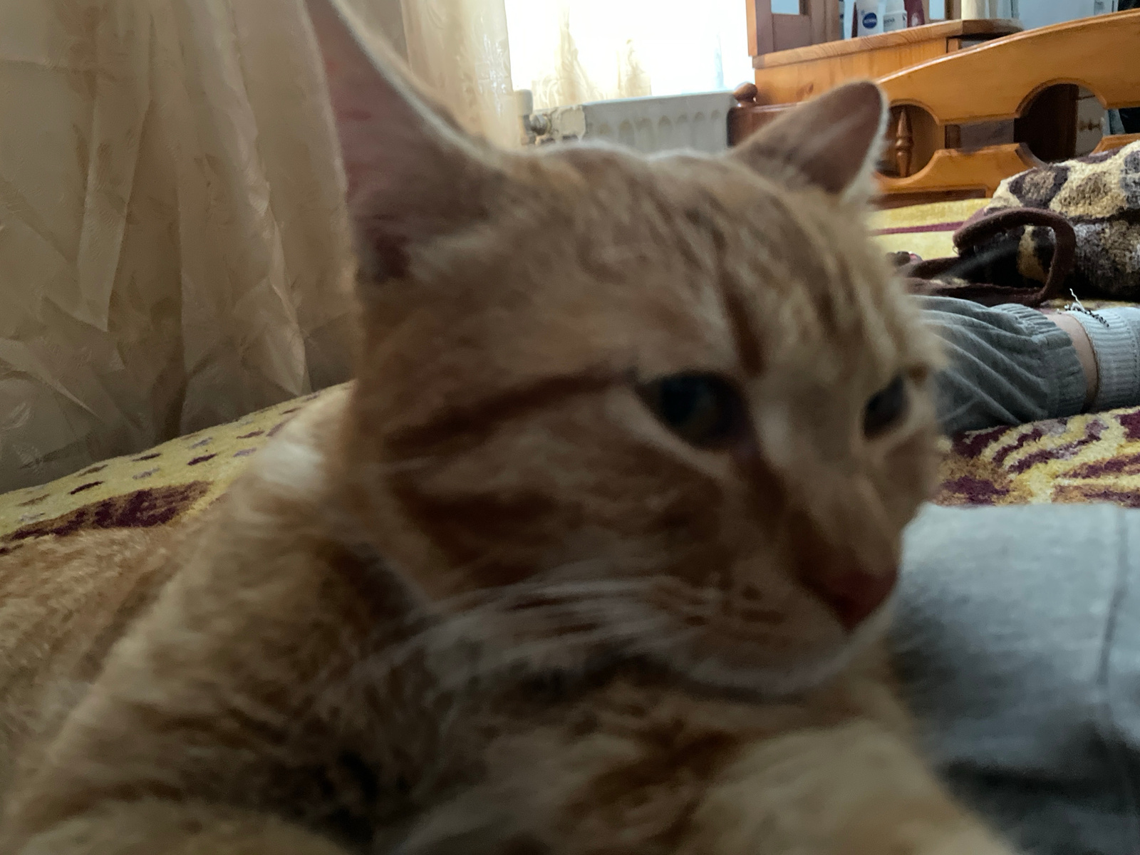 A close-up shot depicts an orange tabby cat indoors. The cat is lying down, partially visible on a patterned blanket or cushion. Behind the cat, a person is visible, wearing grey sweatpants and socks.…read more