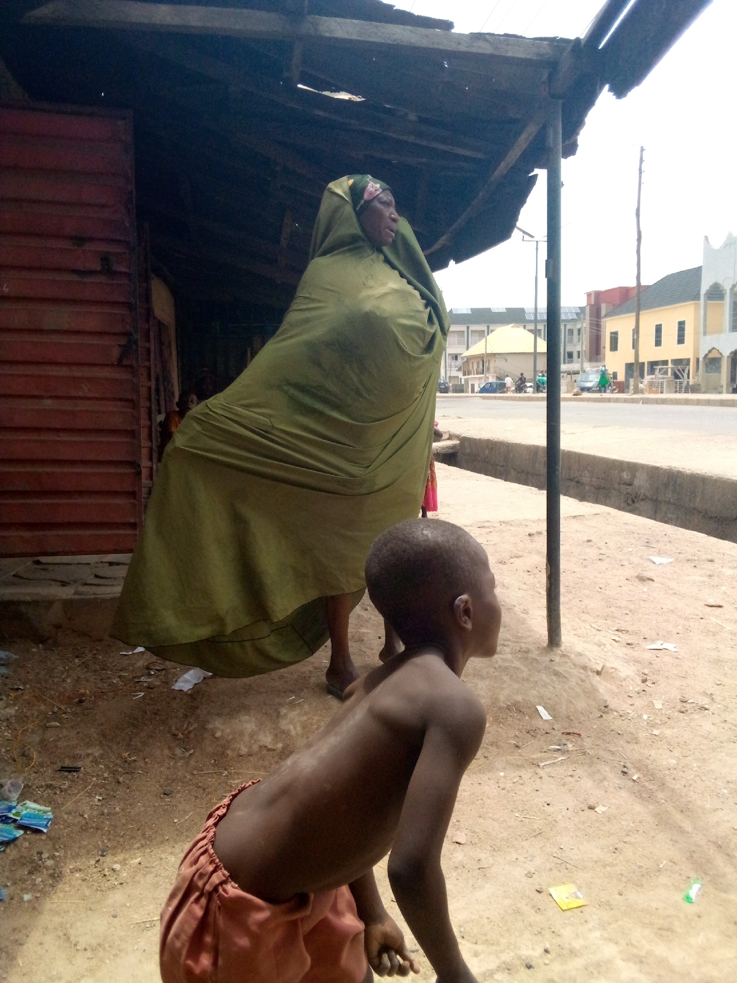 An eye-level, medium-shot captures an older woman draped in a large, green cloth and a young boy in front of a shop in the city of Minna, Nigeria. The woman, wearing a headscarf, stands under a weathe…read more