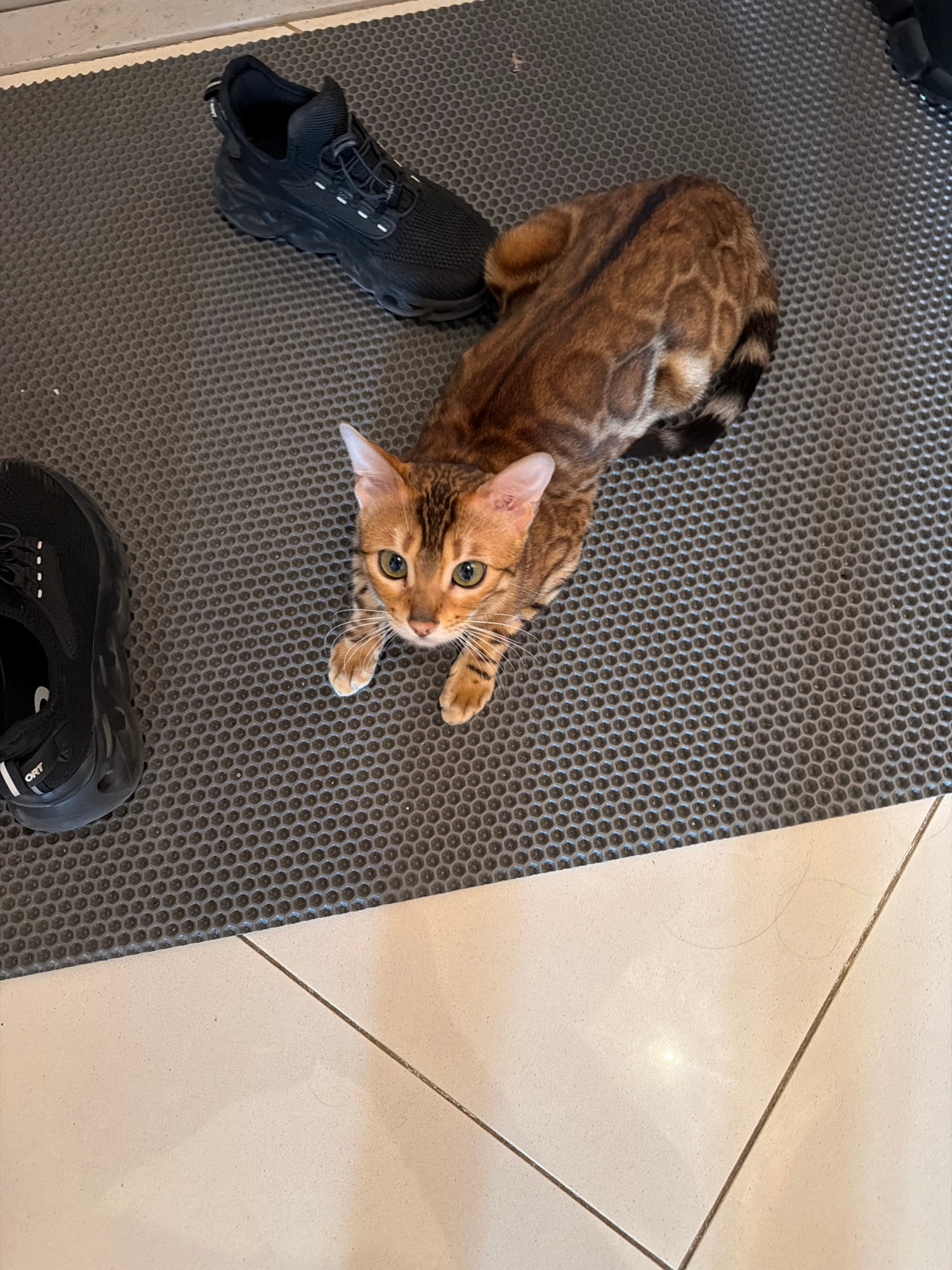 A Bengal cat lies on a dark gray, honeycomb-patterned mat. Beside the cat are two black running shoes. The background includes a tiled floor. The location is unknown but presumed to be indoors. The ci…read more