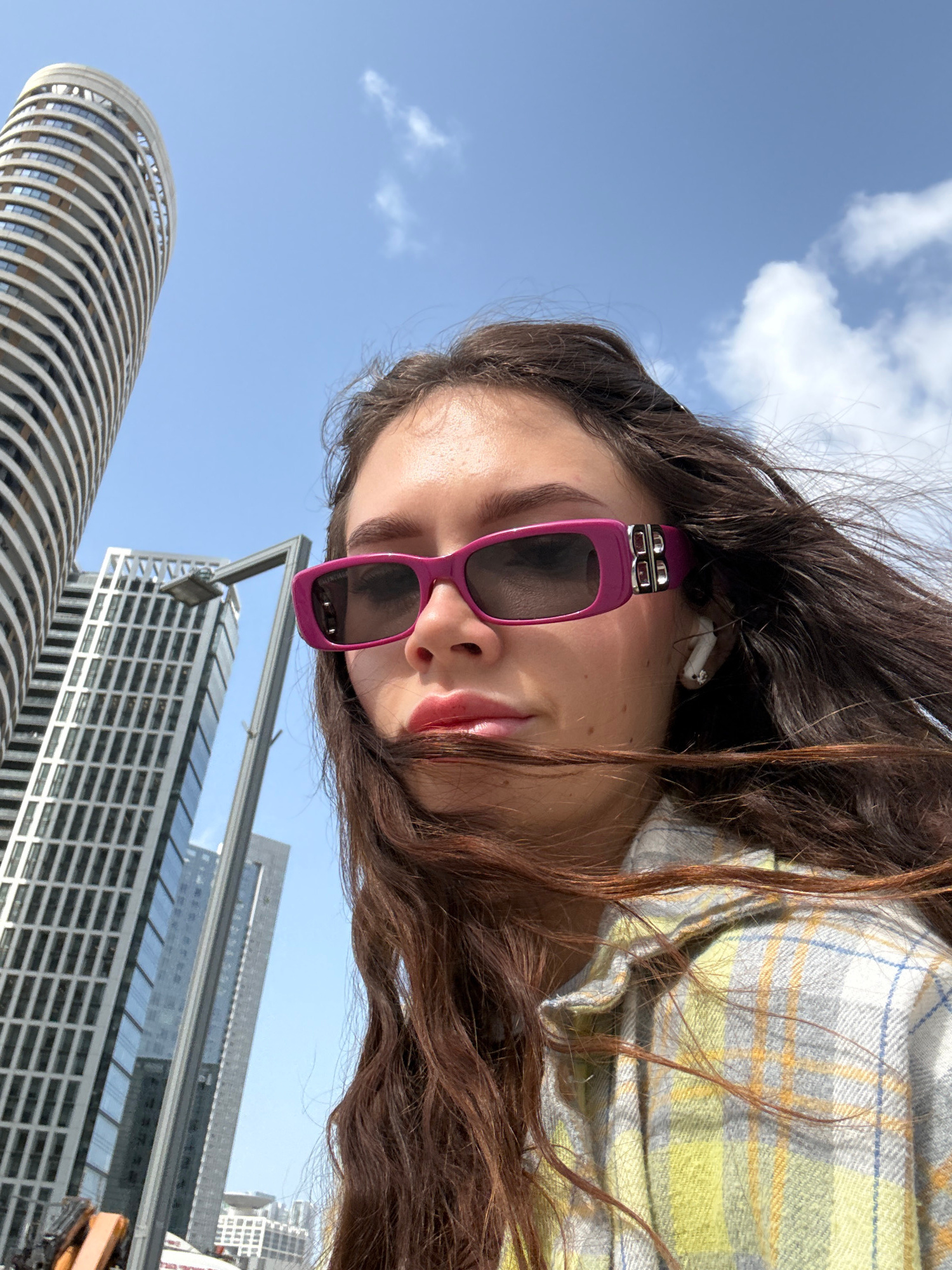 A low-angle shot captures a woman wearing pink sunglasses with dark lenses and an AirPod in her ear. She is wearing a white, green, and yellow plaid top. The background features the clear blue sky wit…read more