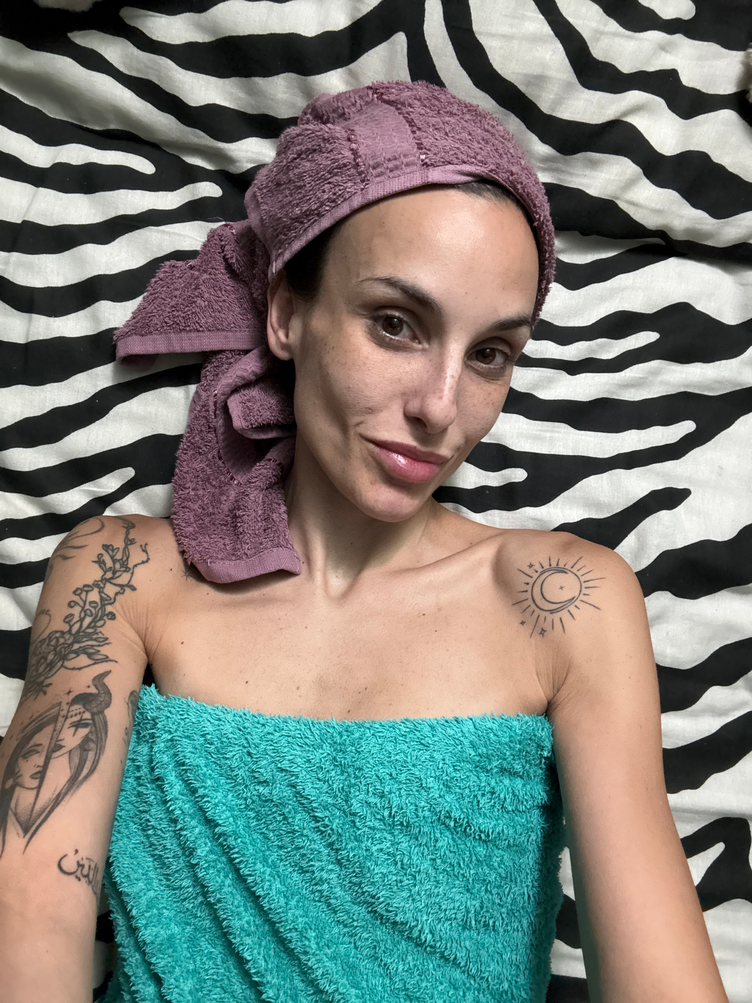 A person is lying on a zebra-striped bed. The person has a purple towel wrapped around their head and a teal towel draped across their body. The person has tattoos on their left shoulder and arm. The…read more