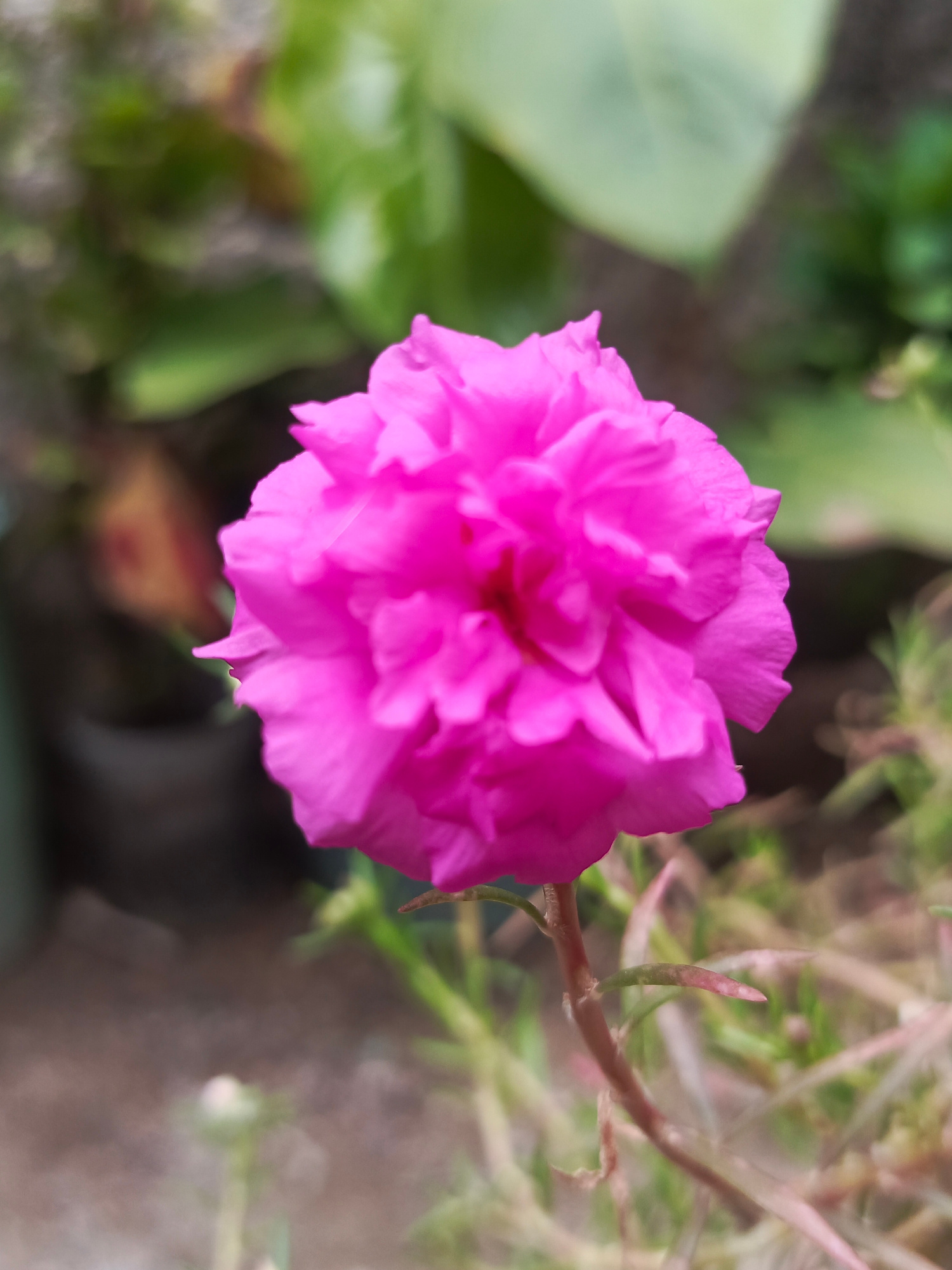 The image shows a bright pink flower, likely a Portulaca grandiflora or moss rose, in close-up. The flower is the main subject and is in focus, with many petals forming a rounded shape. The stem is vi…read more