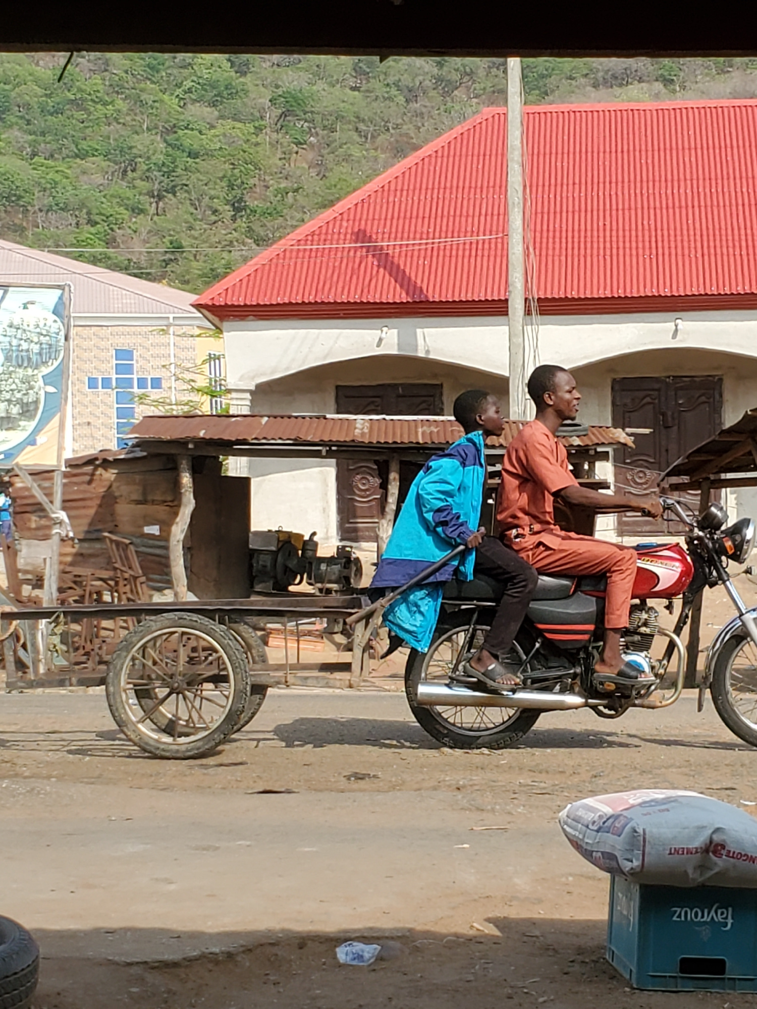 Two men are on a motorcycle-powered tricycle on a dirt road in Mararaba, Nigeria. The driver wears an orange shirt and pants, looking ahead, while the passenger behind him wears a blue shirt. The tric…read more
