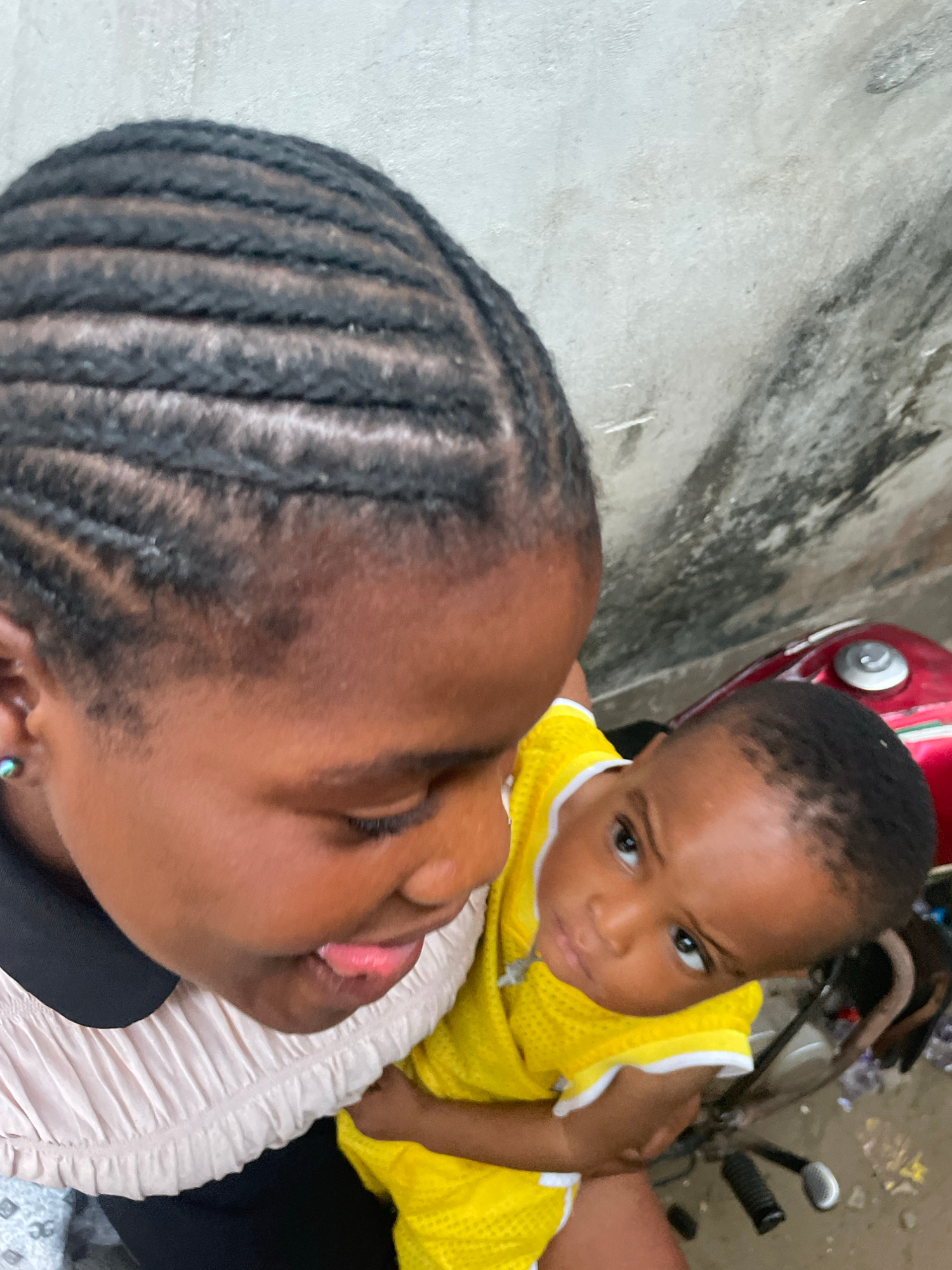 The image captures a close-up, high-angle perspective of a woman with braided hair lying down, with a baby in a yellow outfit positioned above her. The woman's face is turned upwards, with her tongueβ¦read more