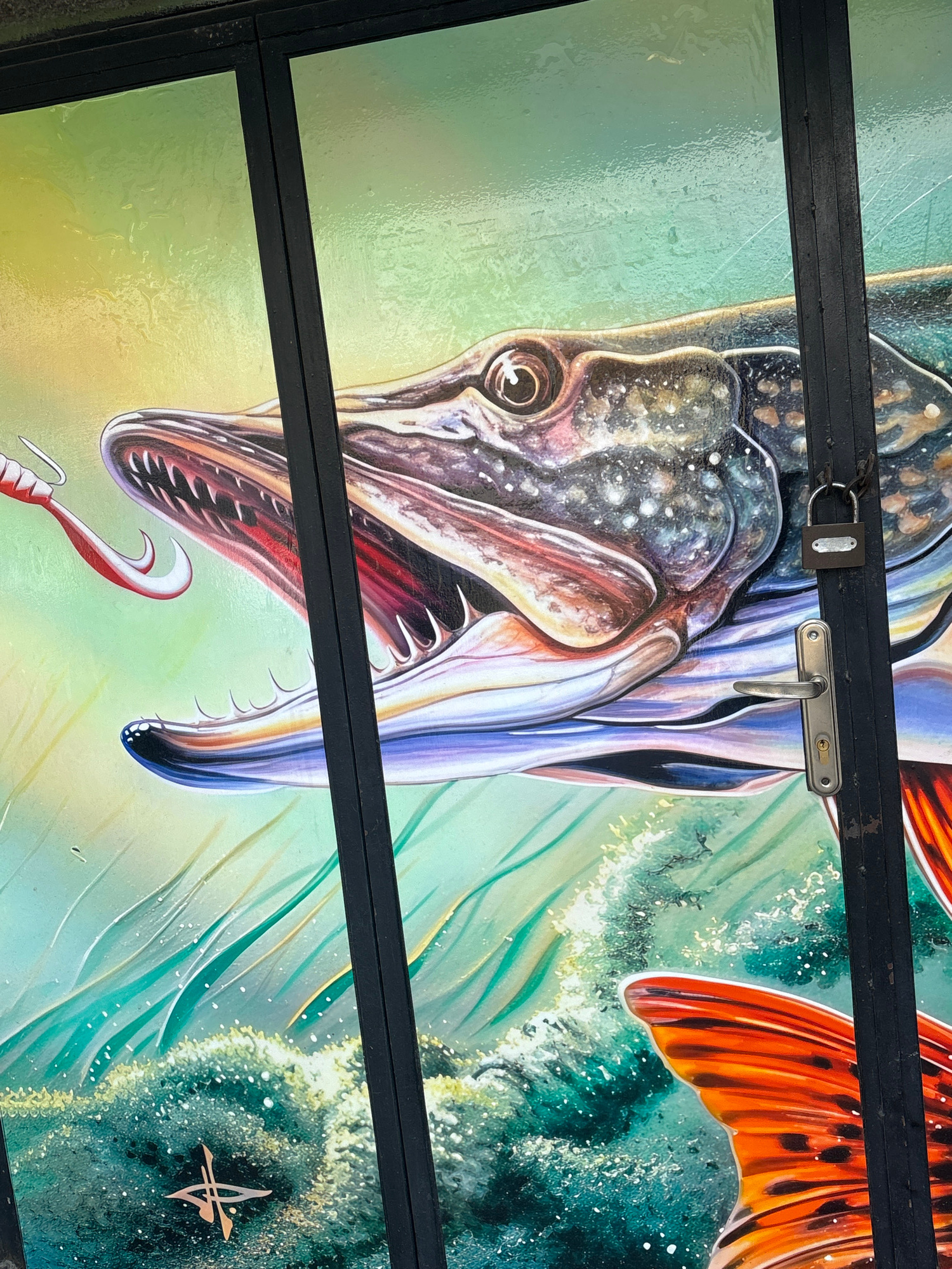The image displays a vibrant and detailed artwork of a large predatory fish, likely a Northern Pike or Muskie, rendered on a panel structure, possibly a garage door. The artwork is divided by two promβ¦read more