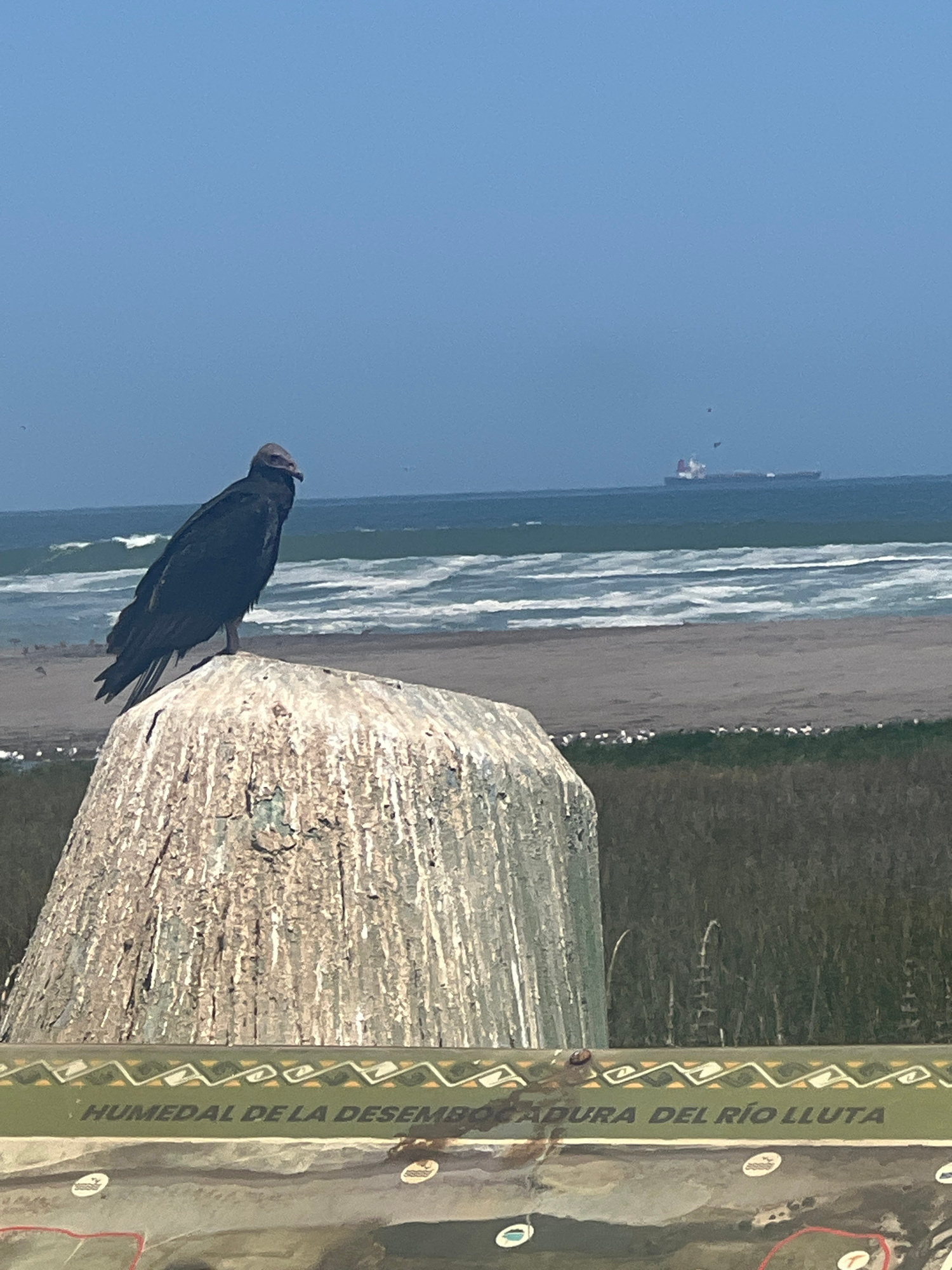 The image depicts a black vulture perched atop a weathered, gray post with a sign bearing the words "HUMEDAL DE LA DESEMB" and "ADURA DEL RÍO LLUTA." The background showcases a beach with waves reachi…read more