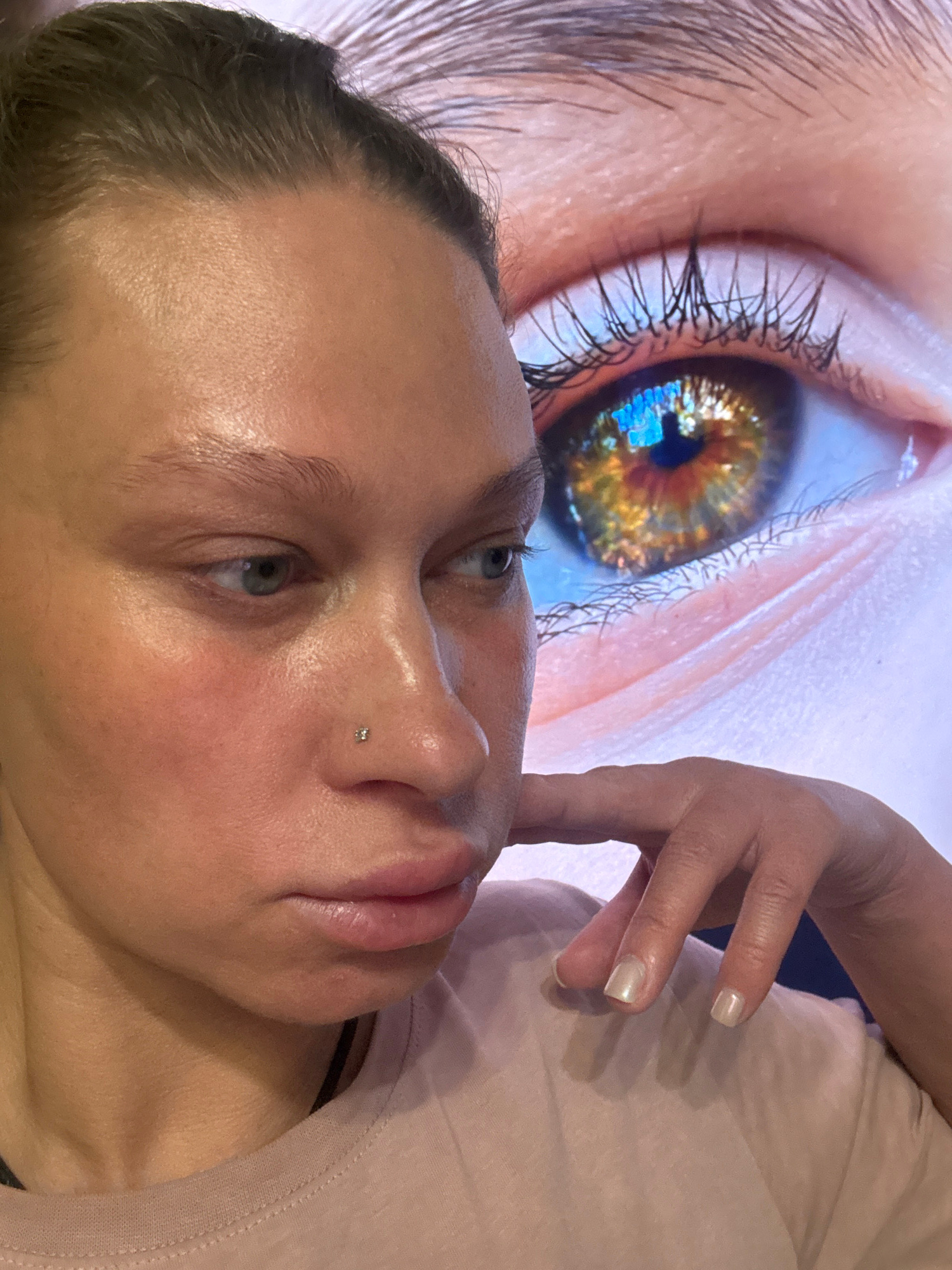 A close-up shot of a woman's face with a nose piercing is juxtaposed with a large image of a human eye in the background. The woman is positioned at an angle, her gaze directed upwards. Her hand is vi…read more
