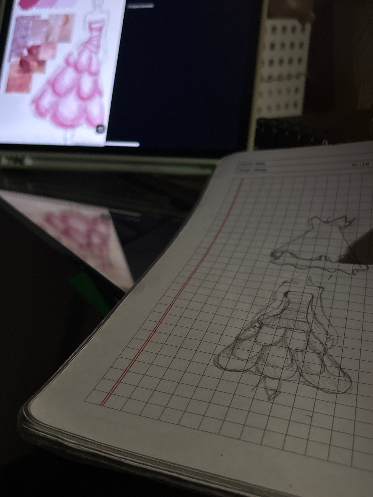 The image shows a notebook with a drawing of a hand and a head on grid paper. The notebook is open and angled towards the camera. In the background, partially out of focus, there is a monitor displayi…read more