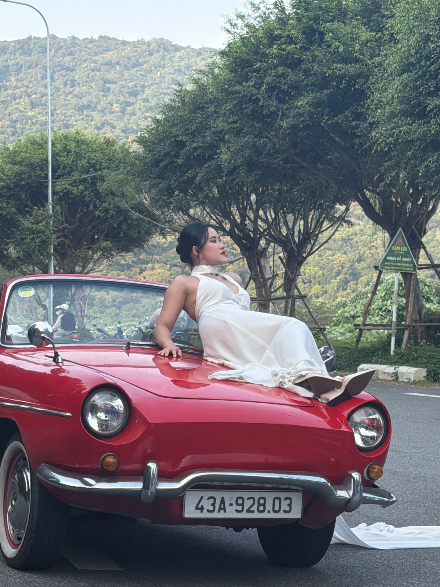 A woman in a white dress leans out of the driver's side window of a vintage red car. The car has a license plate that reads "43A-928.03". The setting appears to be a mountainous area with dense foliag…read more