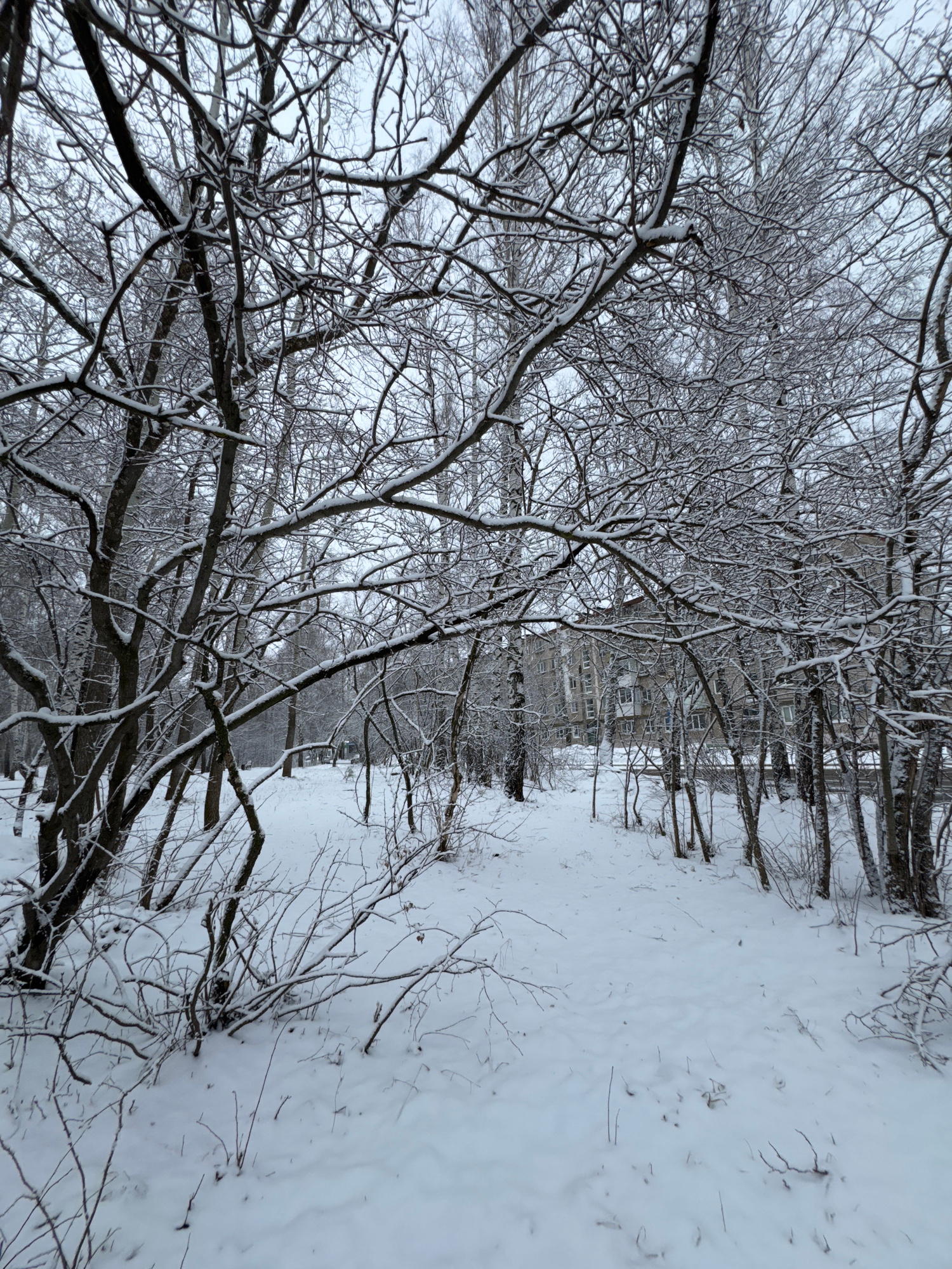 The image depicts a snow-covered landscape, potentially in a park or wooded area in the city of Chaikovsky, Russia. Leafless trees with branches coated in snow dominate the foreground and middle grounβ¦read more
