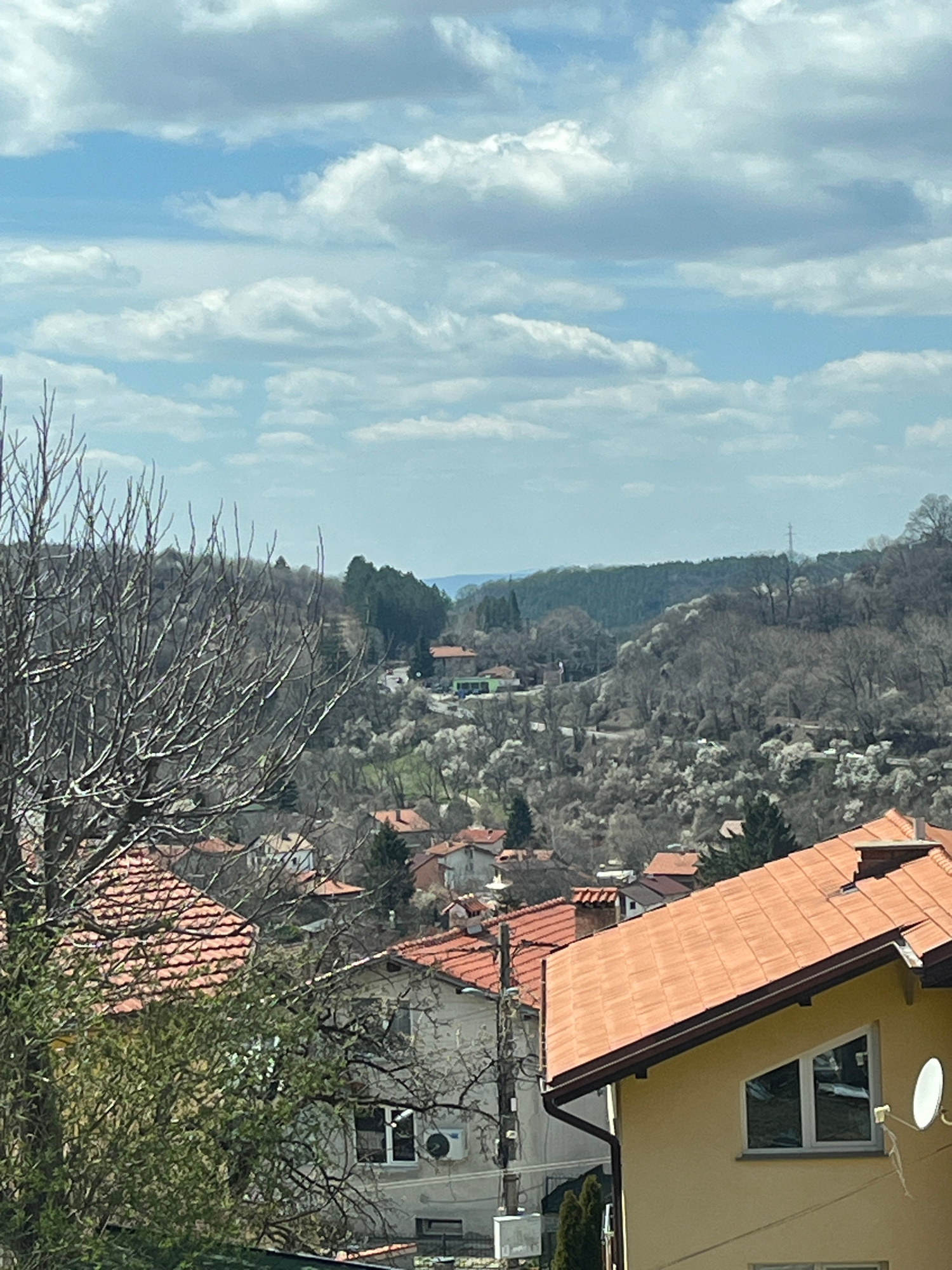 The image depicts a view overlooking the city of Vladaya, Bulgaria. The foreground consists of tree branches, some bare and some with early spring foliage. Residential buildings with red-tiled roofs a…read more