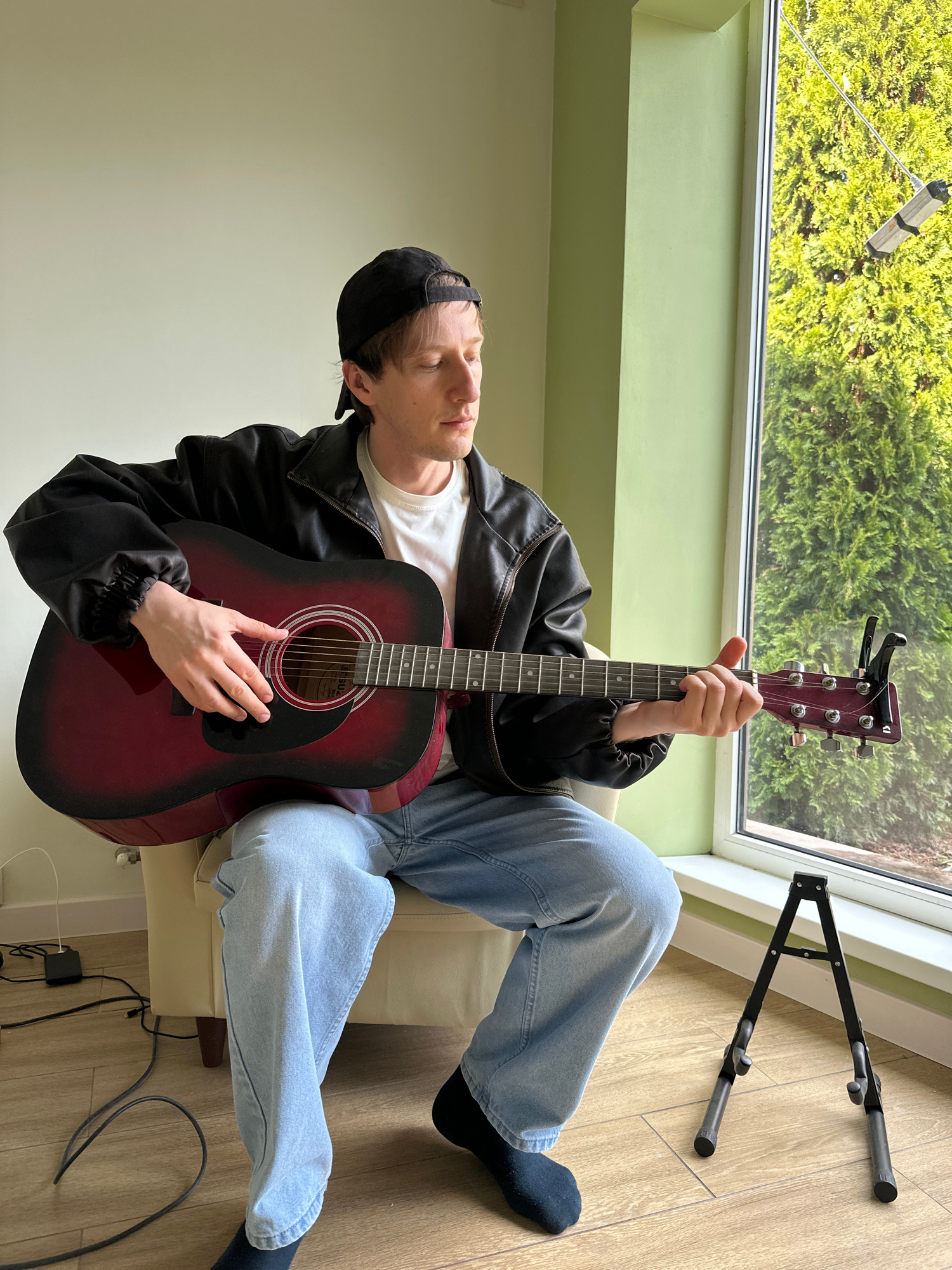 The image depicts a young man seated indoors, holding a red acoustic guitar. He wears a black baseball cap, a white t-shirt under a black jacket, and light blue jeans. His right hand is positioned on…read more