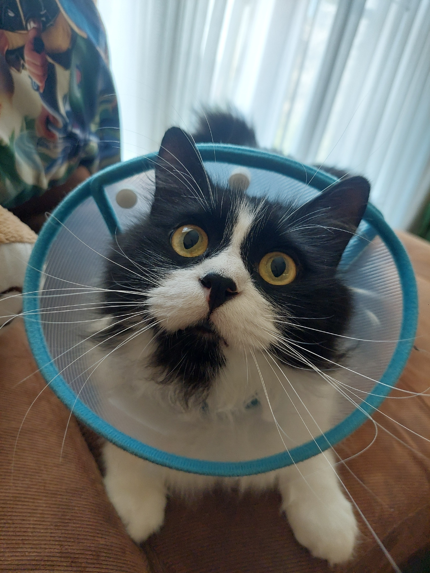 A black and white cat is wearing a blue plastic cone around its head. The cat has yellow eyes and long white whiskers. The background is blurred, but there is a window and a brown surface. The locatioβ¦read more