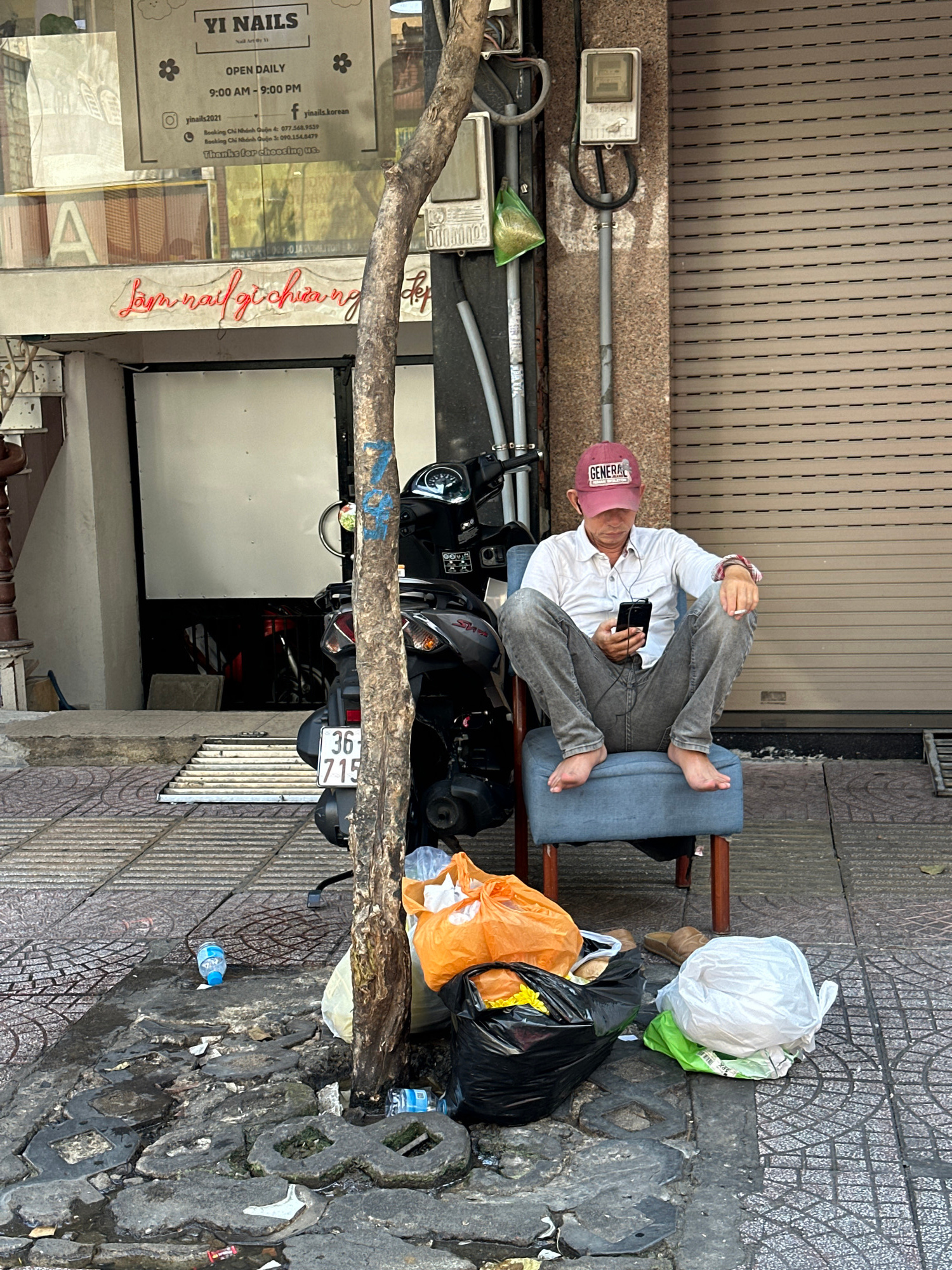 A man in a pink baseball cap and a white shirt sits barefoot on a blue cushion atop a parked black scooter in front of the "YI NAILS" salon in Thủ Đức, Vietnam. He is using a phone. The scooter is parked adjacent to the curb and close to a closed metal shutter door. Several bags of trash are visible on the sidewalk. | Open Wire