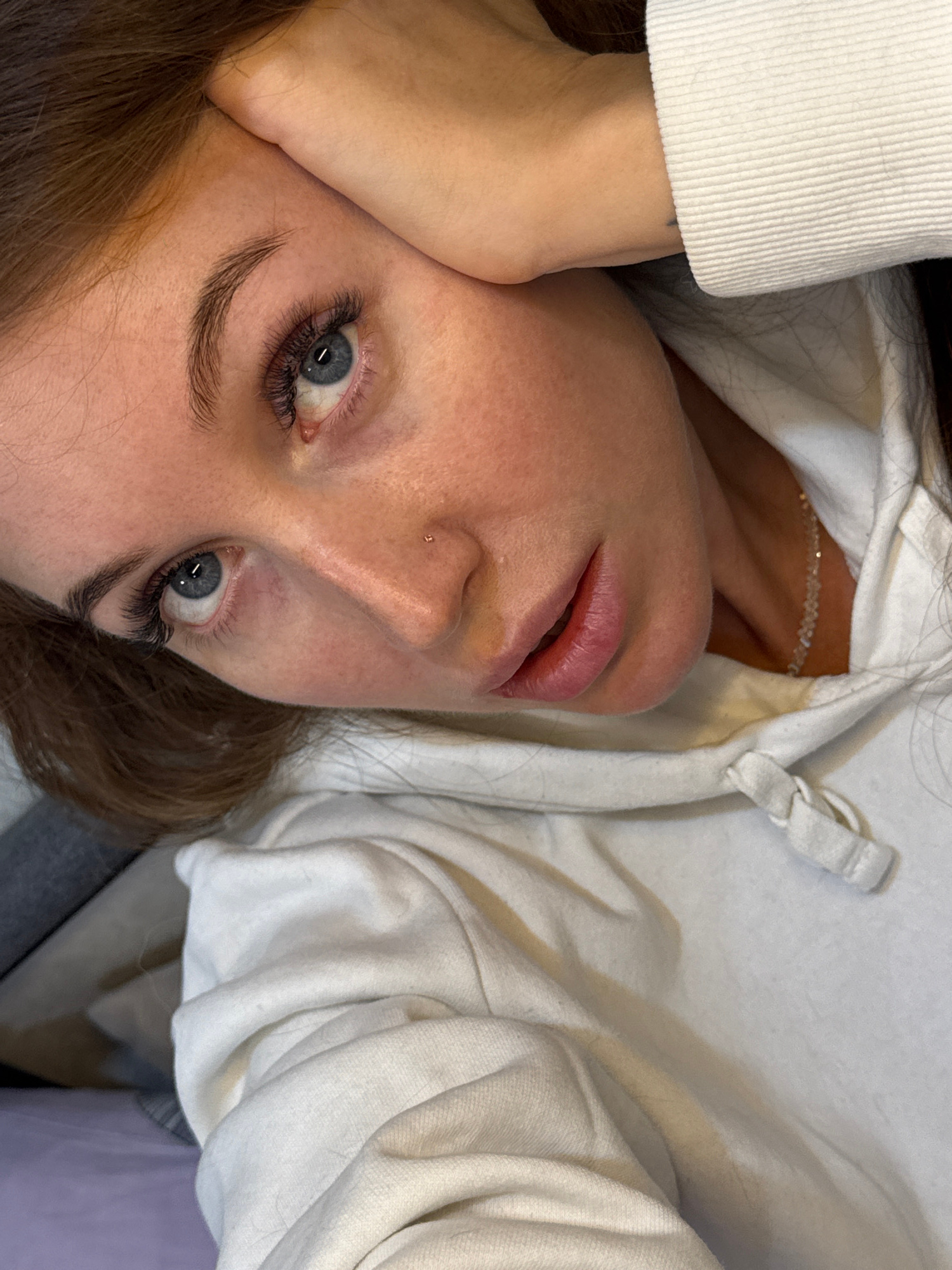 A young woman with blue eyes, brown hair, and a nose piercing is lying down, her head tilted toward the camera. She is wearing a white hoodie and a delicate necklace is visible around her neck. One of…read more
