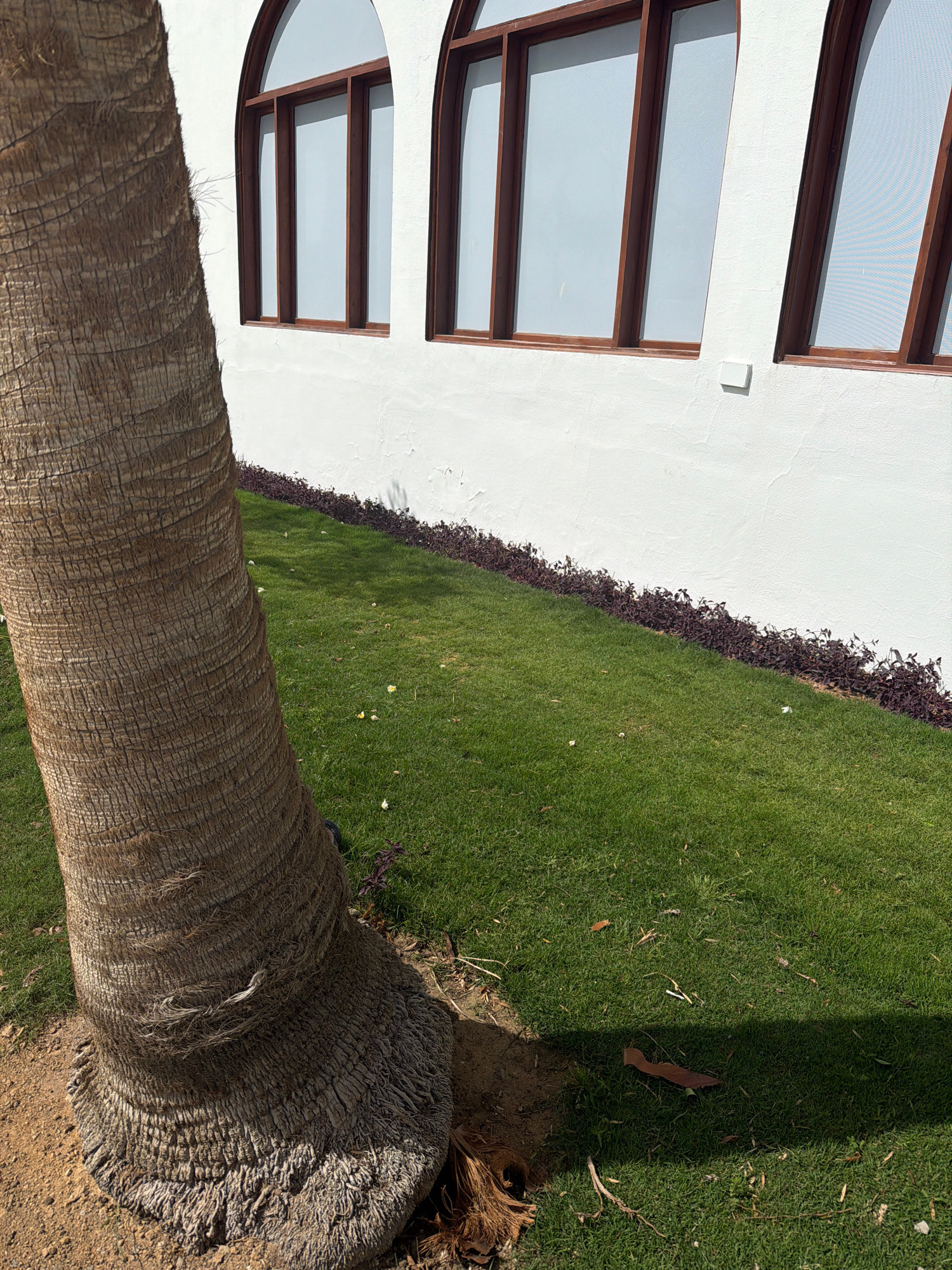 The image depicts a scene in Sharm El Sheikh, Egypt, featuring a white building with brown-framed windows next to a lawn. A row of dark purple shrubs separates the building from the grass. A palm tree…read more