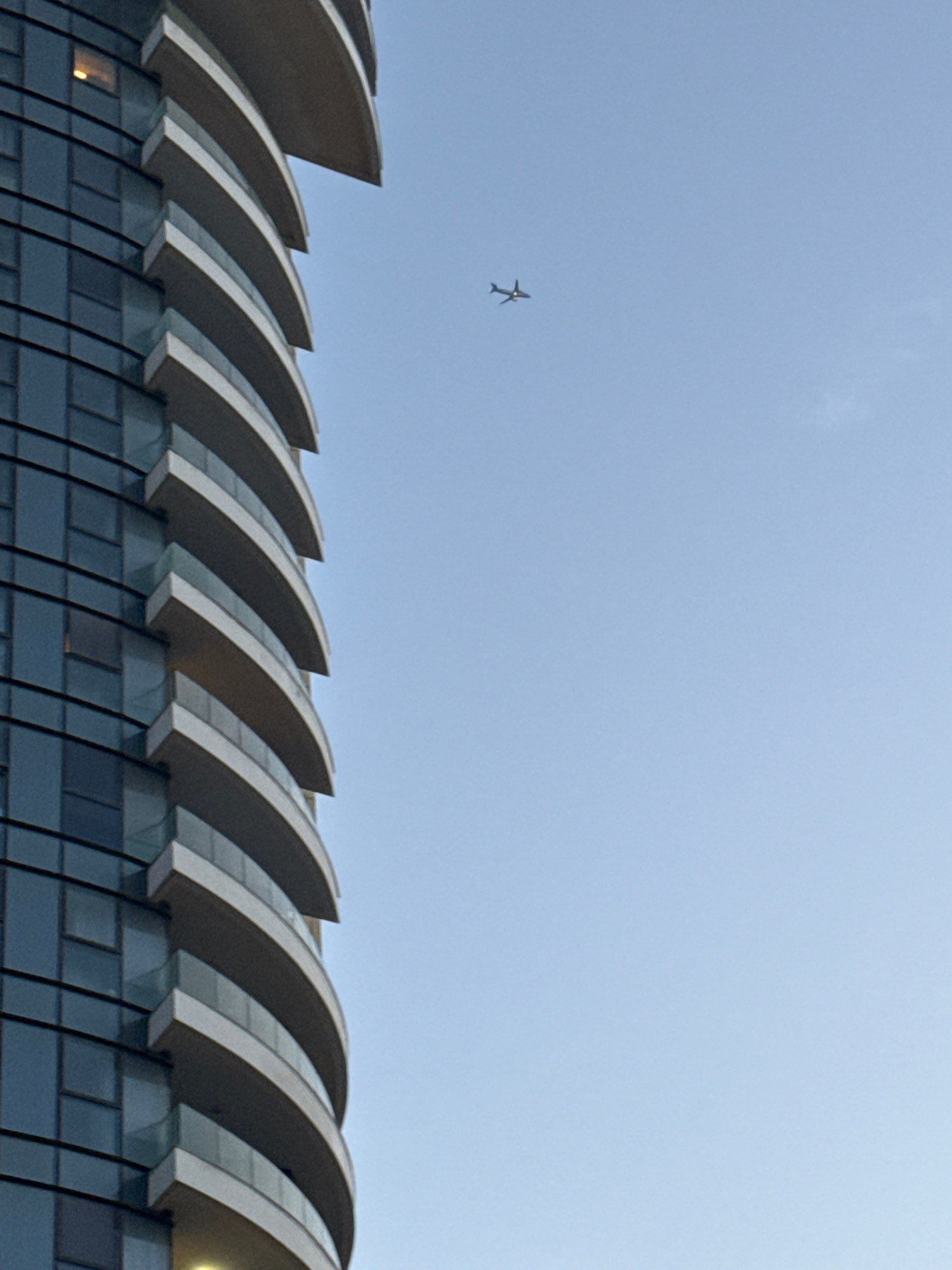 The image shows an airplane in flight against a clear sky above a building facade in Bat Yam, Israel. The building features a repeating pattern of curved architectural elements atop a glass-clad lower…read more