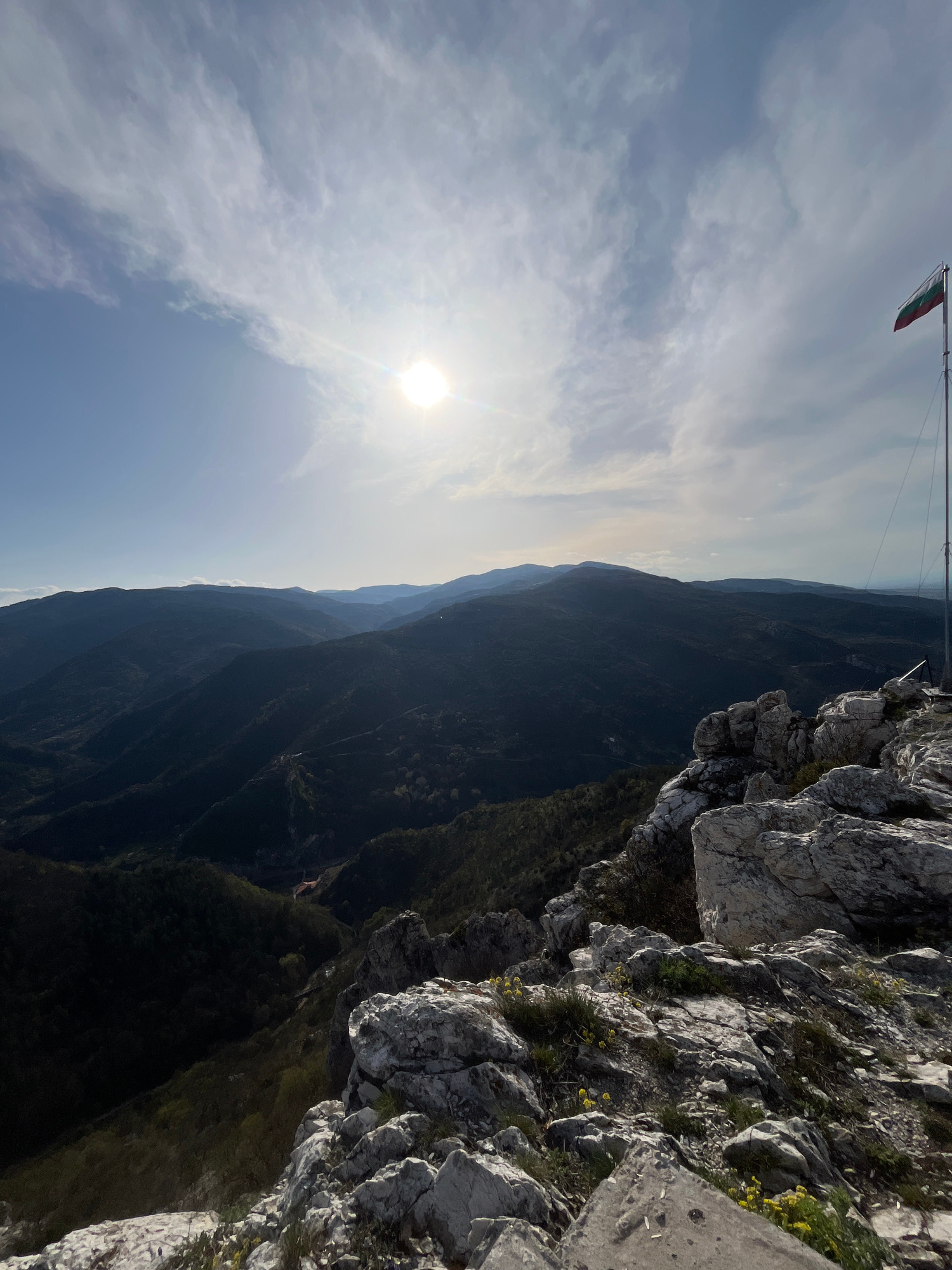 The image shows a mountainous landscape with a rocky cliff in the foreground. The sun is visible in the sky, partially obscured by clouds. A flag, possibly the Bulgarian flag, is mounted on a pole at…read more