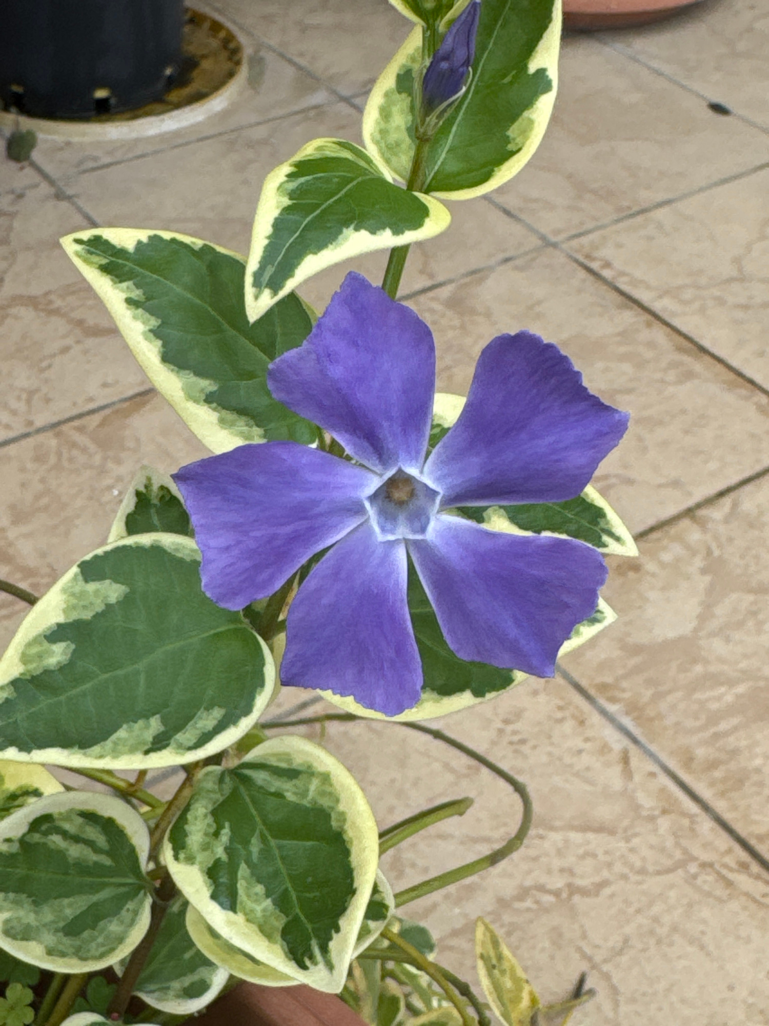 A close-up shot reveals a blue periwinkle flower with five petals, growing among green leaves with white margins. The flower's center has a light-colored stigma. The plant appears to be potted, as a pā¦read more