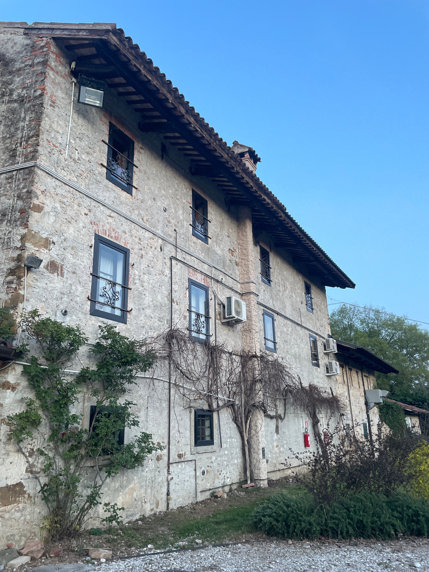 The image depicts the exterior of a multi-story building in San Lorenzo, Italy. The building has a stone facade, windows with decorative metal grilles, and a sloping tiled roof with wooden supports. T…read more